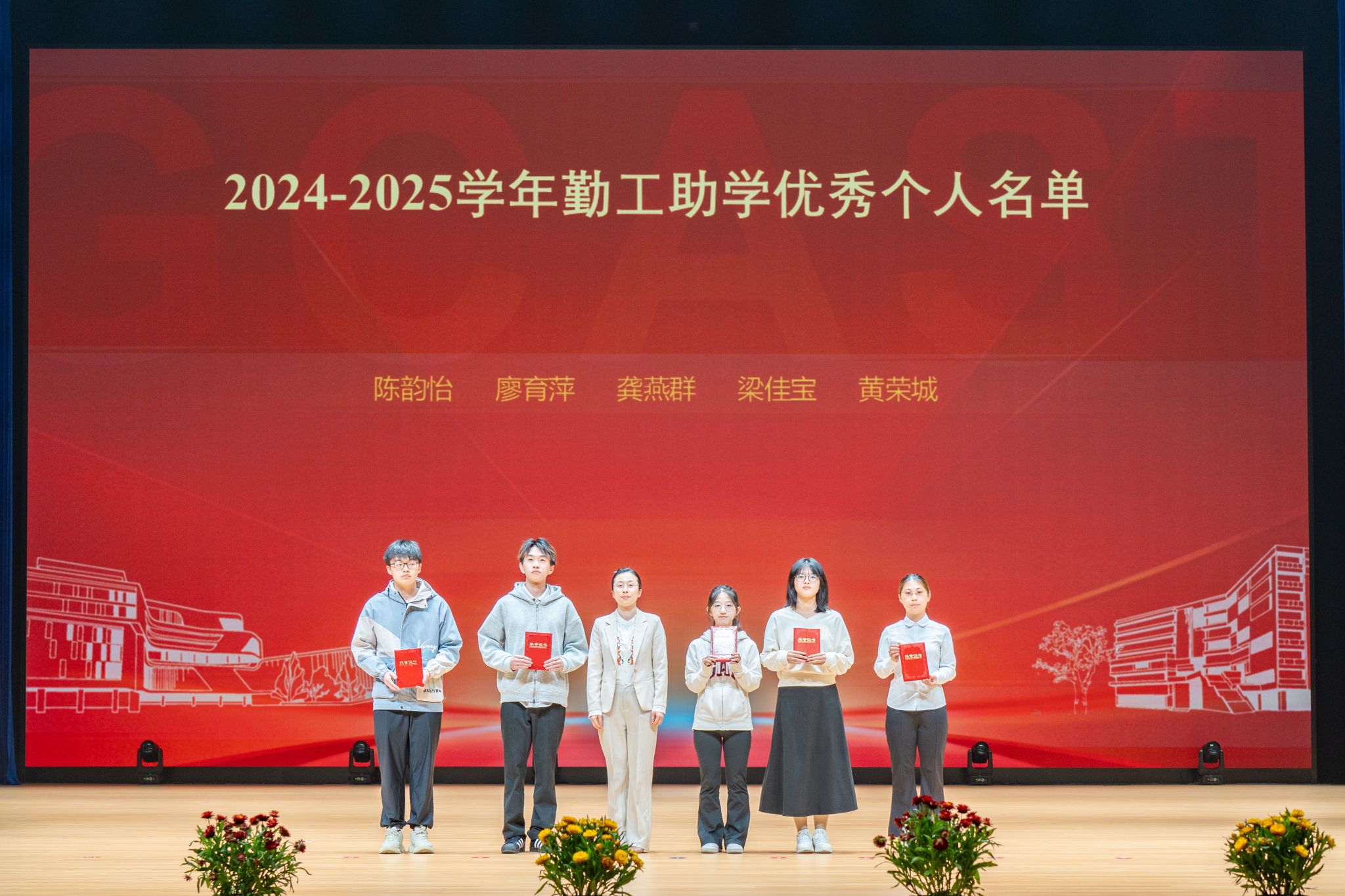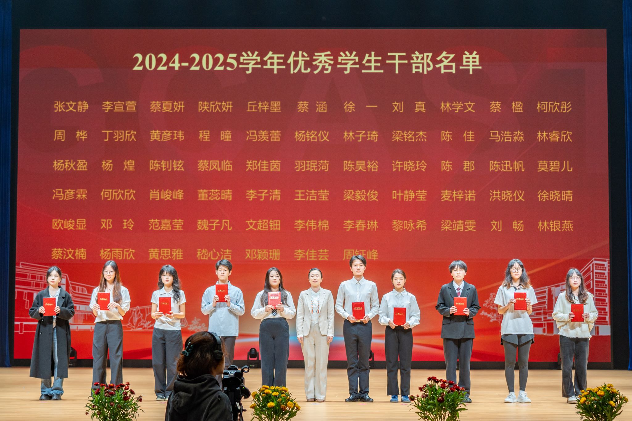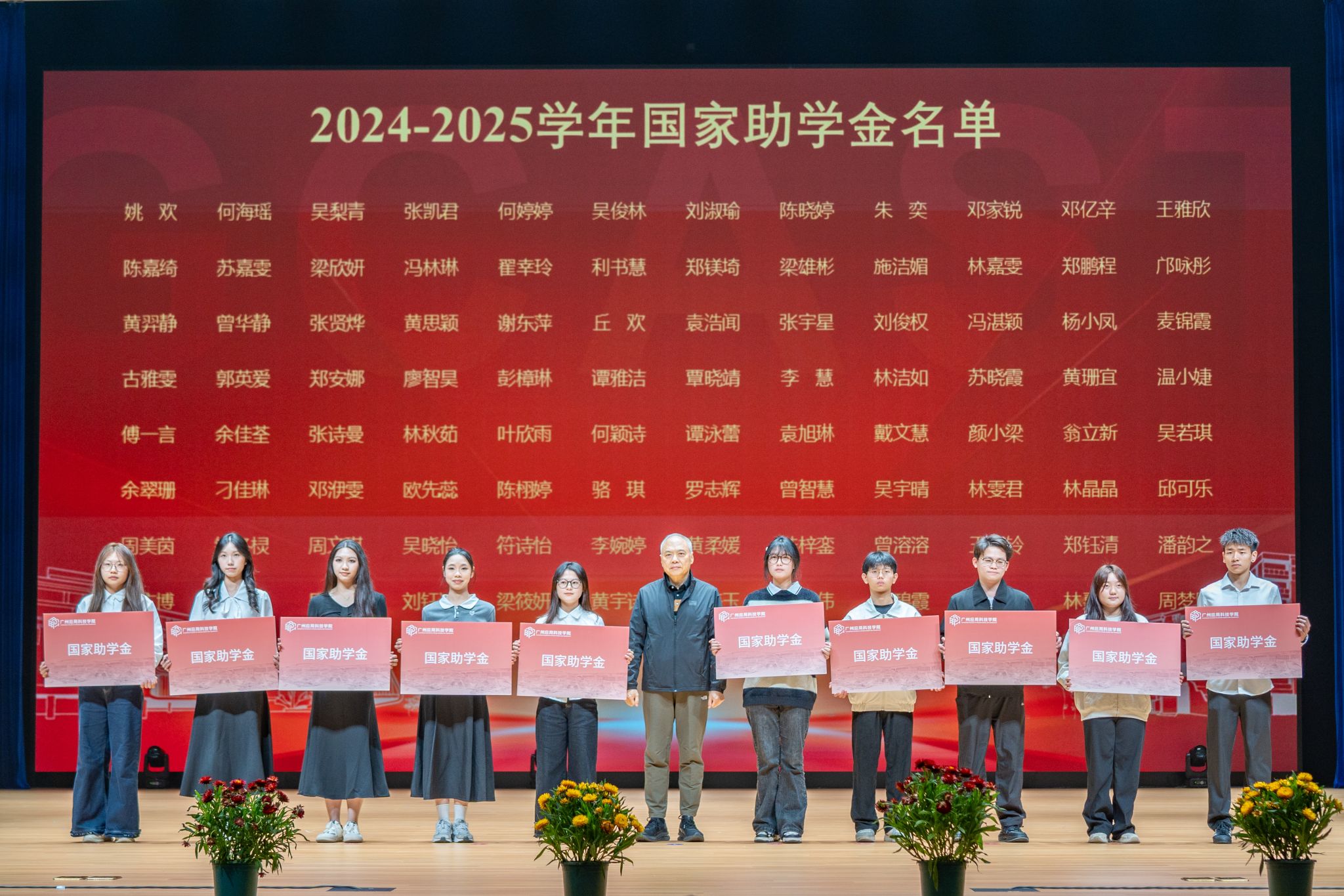 随后,学校党委书记陈光团宣读《广州应用科技学院关于表彰2024-2025学年学生先进个人和先进集体的决定》。为深入学习贯彻党的二十届四中全会和全国教育大会精神,我校始终坚定不移地落实立德树人根本任务,过去一学年,在学风建设、校园文化、社会实践等方面取得了优异成绩,涌现出一批品学兼优的先进个人和先进集体。经广州应用科技学院学生评优评先和奖学金评定工作评审委员会评审通过,报校长办公会审议:钟彩彦等 47 名学生荣获国家奖学金;彭美琪等 1197 名学生荣获国家励志奖学金;林家冰等 84名学生荣获学校一等奖学金;张慧晖等 228 名学生荣获学校二等奖学金;谢驰等 337 名学生荣获学校三等奖学金;王为祥等 3 名学生荣获成绩进步奖学金;梁卓盈等 255 名学生荣获单项奖学金;胡晓敏等 584 名学生荣获“优秀大学生标兵”称号;李洋莉等 1319 名学生荣获“优秀大学生”称号;余宛蓉等 842 名学生荣获“优秀学生干部”称号;陈韵怡等 5 名学生荣获“勤工助学优秀个人”称号;经济与管理学院 2023 级会计学(3)班等 29 个班级荣获“先进班集体”称号;学生公寓 D 座 0332 等 86 间宿舍荣获“最美宿舍”称号。
