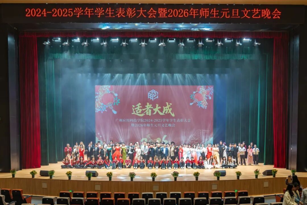 时光荏苒,辞旧迎新。2025年12月30日晚,广州应用科技学院2024-2025学年学生表彰大会暨2026年师生元旦文艺晚会在肇庆校区莲花大剧院温情举行。广州应用科技学院校长张光宇,党委书记陈光团,常务副校长吴舸,党委副书记、副校长刘志新,校长助理吴明生,校长助理李根珍,财务总监姚满金等党政校领导出席晚会,并为获表彰的学生代表颁奖,各相关职能部门负责人、二级学院院长、全体辅导员以及学生代表参加表彰大会和晚会,在荣誉表彰的庄重氛围与文艺表演的热烈氛围中,共同回望成长、致敬榜样,迎接崭新一年的到来。