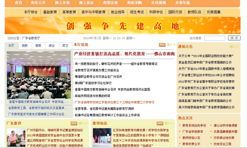 广东省教育厅门户网站首页7月1日上午截图。
