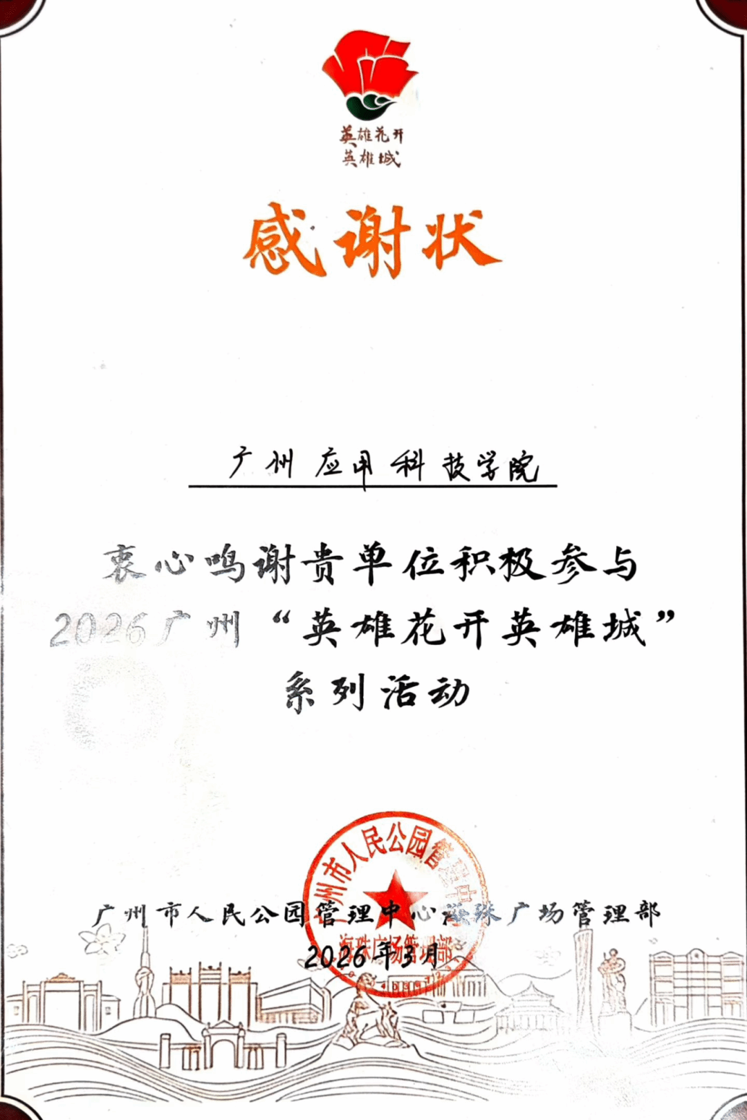 演出现场,广州应用科技学院学子精神饱满、仪态大方。凭借扎实的专业功底、沉稳的舞台表现力和真挚动人的情感,他们完美诠释了两部作品的精髓,充分展现了广应科学子的青春风采与专业素养。演出圆满结束后,广州市人民公园海珠广场管理部作为专场承办单位,为全体参演学生颁发了“优秀演员”荣誉证书,并向学校及两位指导老师致送感谢信,对学校师生的精心筹备、精彩演绎以及为活动圆满举办作出的积极贡献,给予了充分肯定与高度认可。