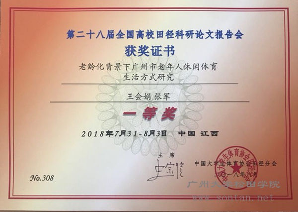 近日,由中国大学生体育协会田径协会主办、井冈山大学承办的第二十八届全国高校田径科研论文报告会,在井冈山大学隆重举行。我院社会体育系王会娟、张军老师的《老龄化背景下广州市老年人休闲体育生活方式研究》被大会录用为大会报告论文。王会娟老师在大会上做了精彩发言报告,并与参会的其他高校专家、教授、进行进行了热烈的讨论与交流。该论文受到报告会权威专家的一致好评,经专家评审组分组评议、集体讨论、投票,最终荣获本次科研论文报告会大会一等奖。