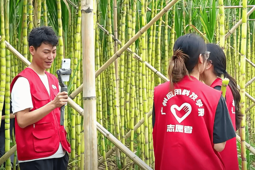 上午8:30,15名学生准时抵达蔗田。没有多余寒暄,大家迅速进入角色:测试信号、调整机位、发布预热短视频……一切井然有序。