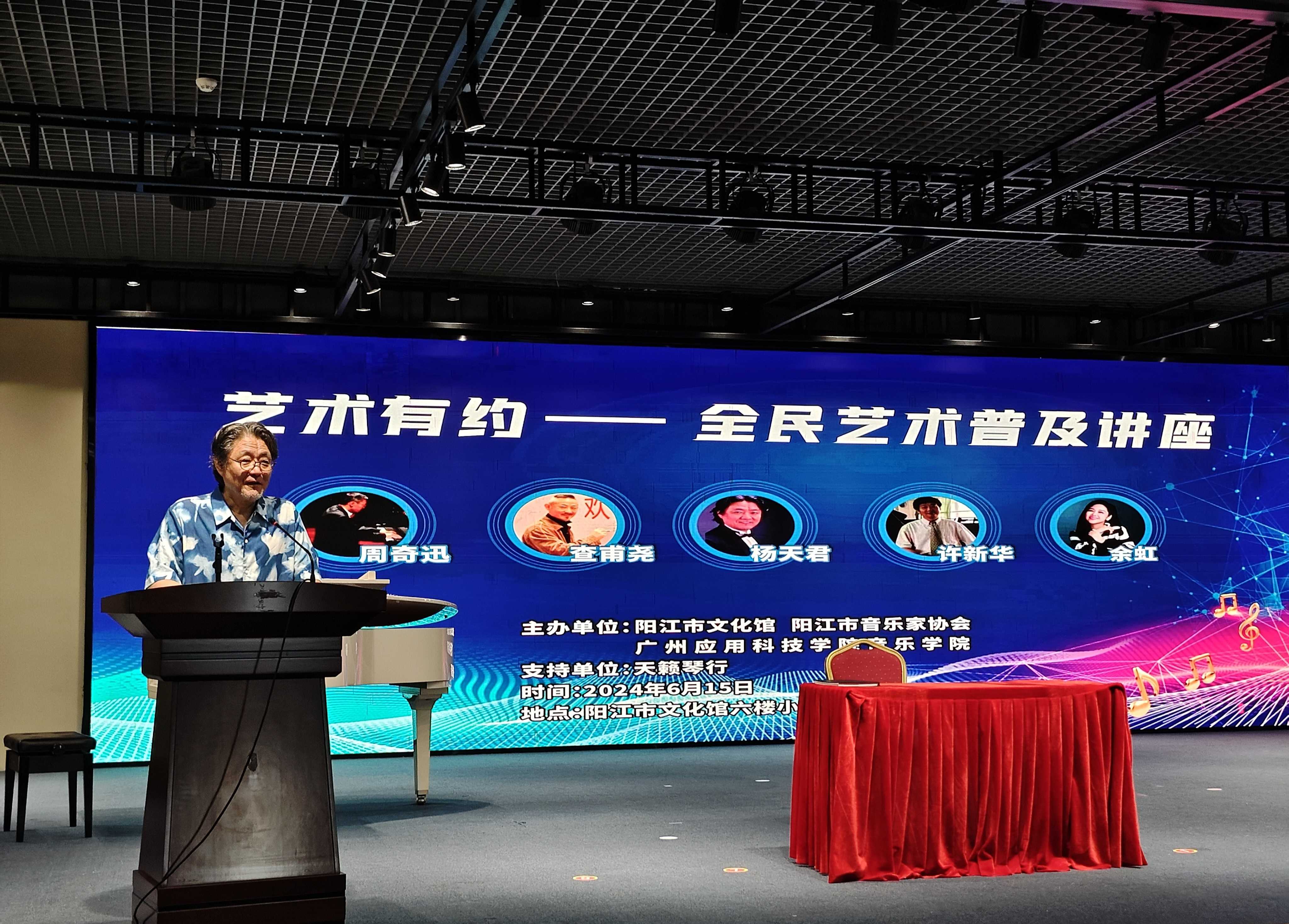 美育浸润心灵,艺术点亮生活。6月15日,艺术有约——全民艺术普及讲座在阳江市文化馆举行。本次讲座由阳江市文化馆、阳江市音乐家协会与广州应用科技学院音乐学院联合主办。阳江市文联党组成员、专职副主席林冠儿,阳江市文化馆主要负责人许世欢,...