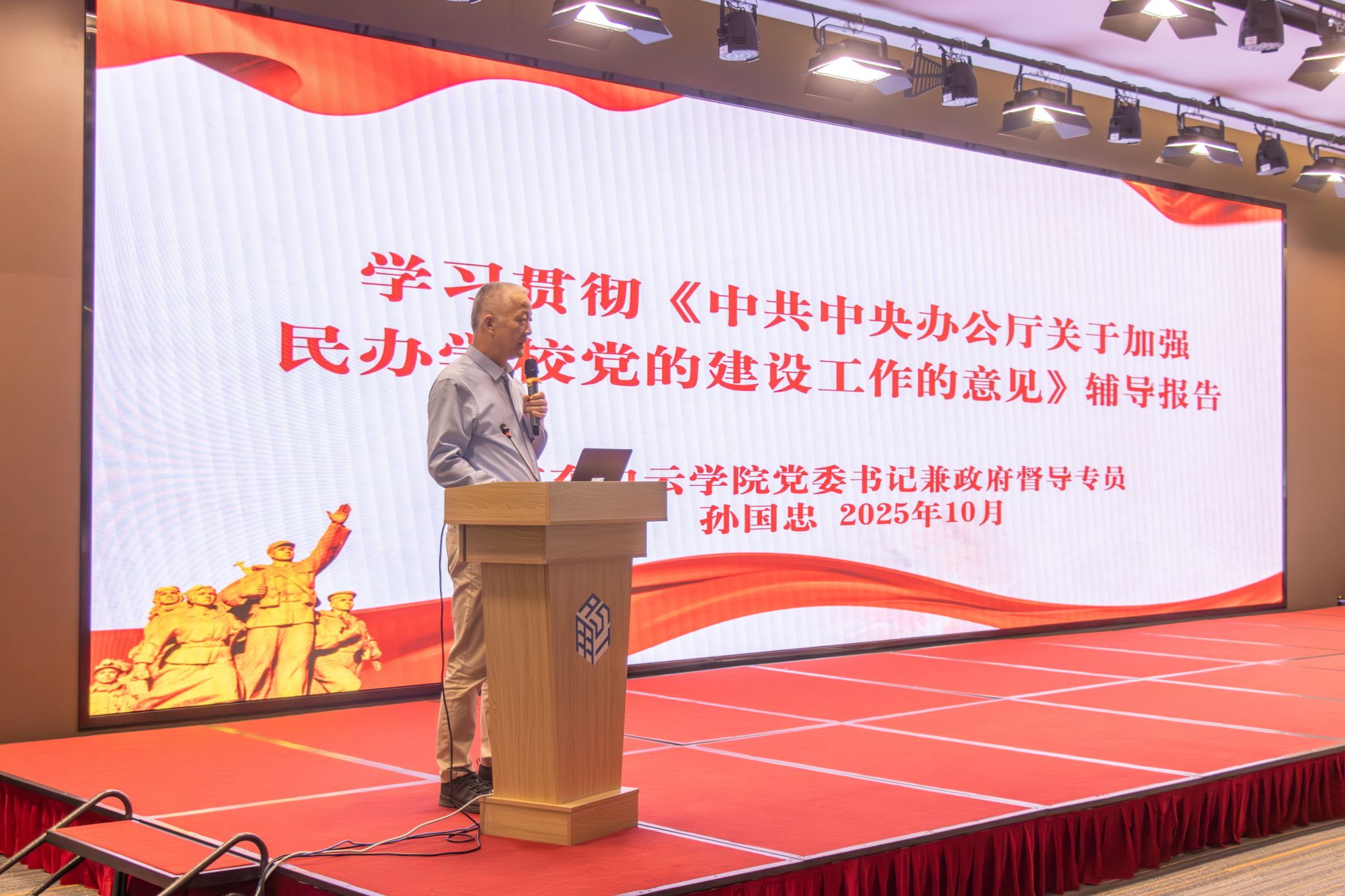 在专题授课环节,广东省高校党建研究会民办院校分会会长、中国民办教育协会党建专委会副理事长、广东白云学院党委书记孙国忠对《中共中央办公厅关于加强民办学校党的建设工作的意见》进行了系统解读。他深入阐述了加强党对民办高校领导的重大意义,分析了当前民办高校党建工作中存在的短板,强调必须坚持党的全面领导,发挥党组织战斗堡垒和党员先锋模范作用,不断推进学校内涵式发展。