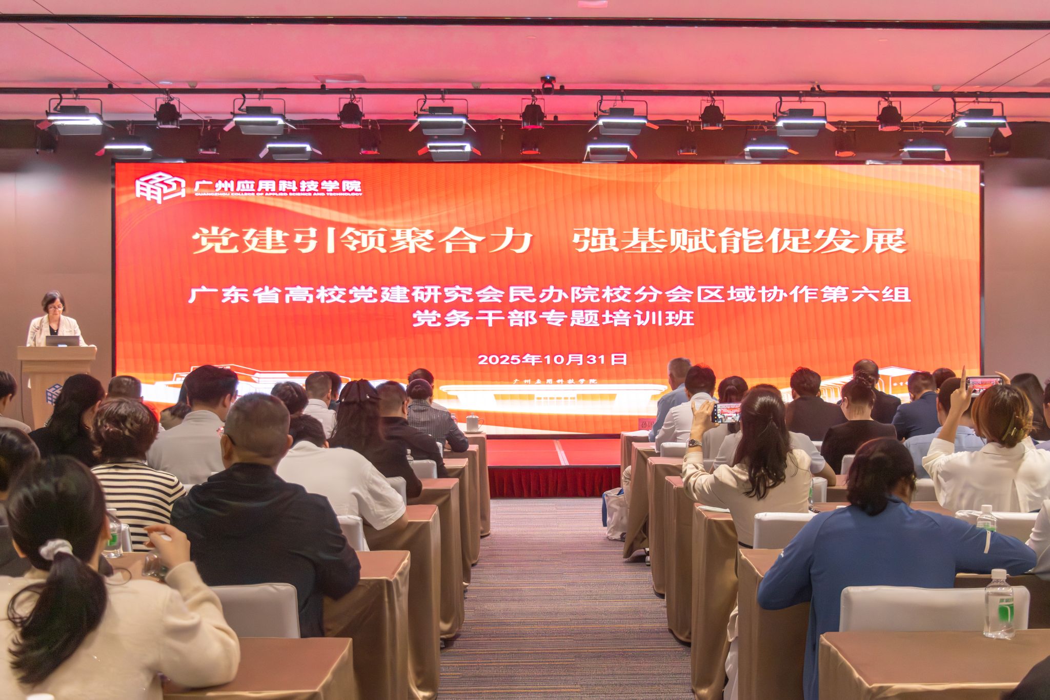 为推动民办高校党建工作高质量发展,提升党务干部政治素养与业务能力,10月31日,广东省高校党建研究会民办院校分会区域协作第六组党务干部专题培训班在广州应用科技学院肇庆校区国际会议中心成功举办。本次培训聚焦中央文件解读与党建“双创”经验交流,来自广东工商职业技术大学、广州应用科技学院、广东东软学院、广东理工学院、广东亚视演艺职业学院、广东碧桂园职业学院、广东肇庆航空职业学院、广东信息工程职业学院等民办高校党委书记兼政府督导专员、党委组织部部长、二级院系党组织书记、机关党支部书记,以及我校党委相关职能部门负责人、全体专职组织员和基层党支部书记共119名党务干部齐聚我校,共话党建引领发展新路径。广东省高校党建研究会民办院校分会会长、中国民办教育协会党建专委会副理事长、广东白云学院党委书记兼政府督导专员孙国忠,广东外语外贸大学党委委员、中文学院党委书记谢秀兰分别作专题辅导报告。我校党委书记兼政府督导专员陈光团代表学校致欢迎辞,广东工商职业技术大学党委书记兼政府督导专员丁勇代表组长单位致辞。培训班由我校党委副书记刘志新主持。