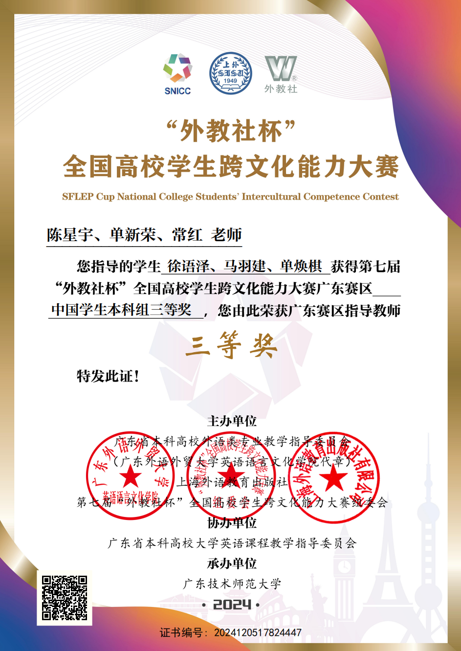 本次大赛由广东省本科高校外语类专业教学指导委员会与上海外语教育出版社联合主办,旨在提升大学生的跨文化交流能力,培养具有国际视野的高素质人才。自大赛启动以来,吸引了广东省内众多高校团队积极参与。经过校级比赛和省复赛的激烈角逐,广州应用科技学院国际教育学院代表队成功获得广东赛区中国学生本科组“三等奖”。