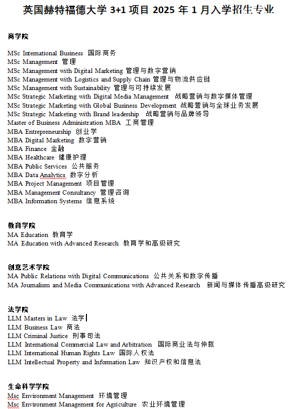 申请硕士专业:涵盖赫特福德大学创意艺术学院、商学院、法学院、教育学院、生命和医学科学学院的相关专业(详细信息见图一)