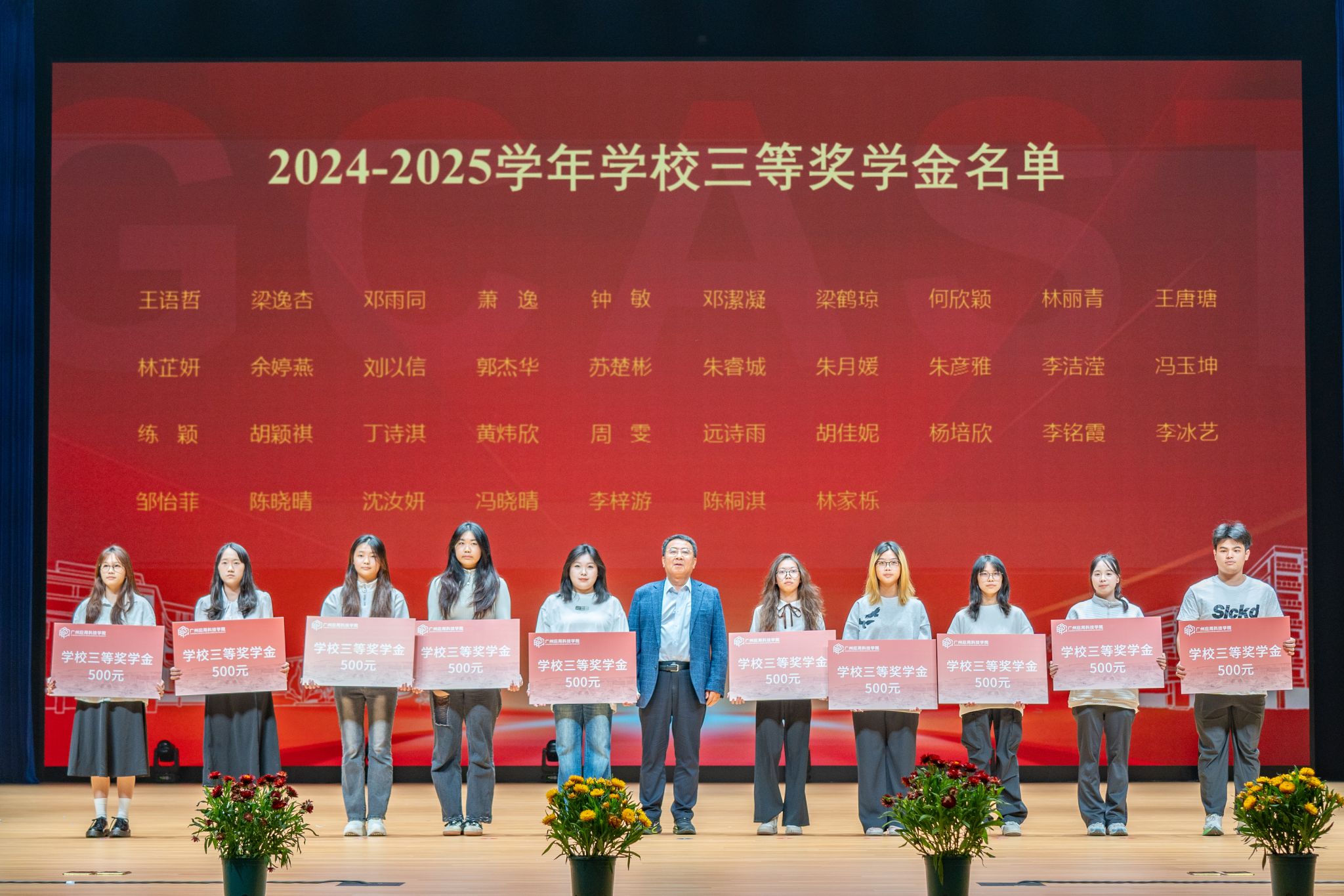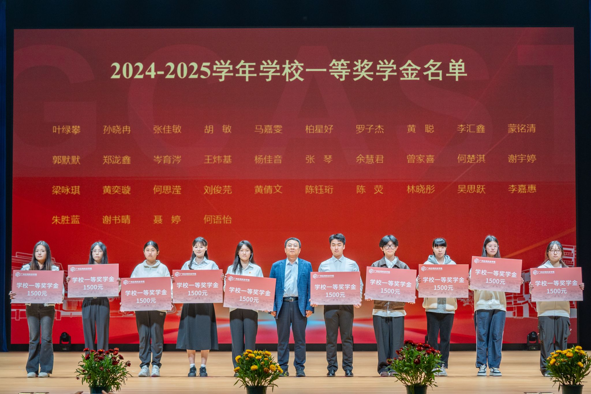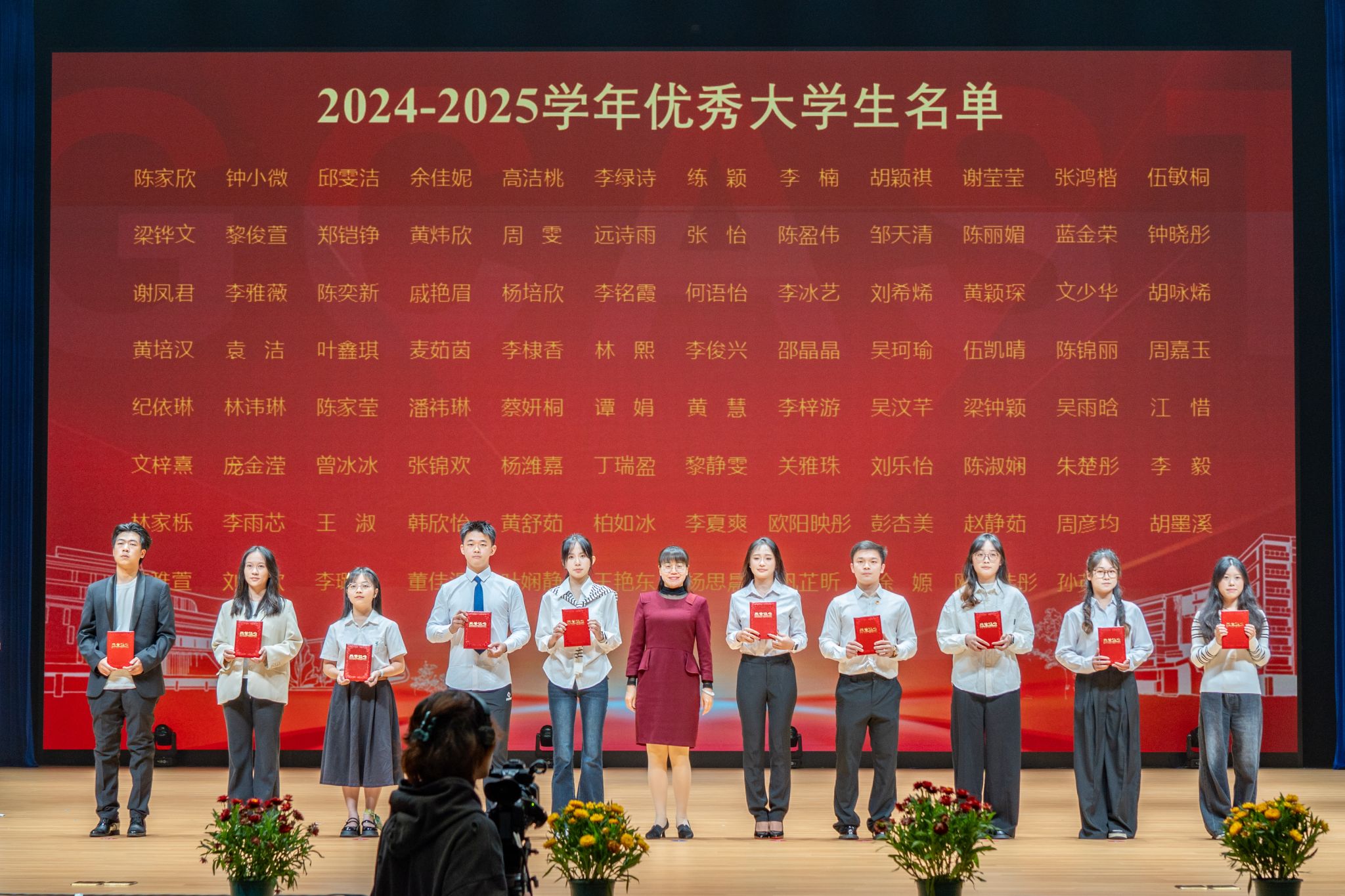 随后,学校党委书记陈光团宣读《广州应用科技学院关于表彰2024-2025学年学生先进个人和先进集体的决定》。为深入学习贯彻党的二十届四中全会和全国教育大会精神,我校始终坚定不移地落实立德树人根本任务,过去一学年,在学风建设、校园文化、社会实践等方面取得了优异成绩,涌现出一批品学兼优的先进个人和先进集体。经广州应用科技学院学生评优评先和奖学金评定工作评审委员会评审通过,报校长办公会审议:钟彩彦等 47 名学生荣获国家奖学金;彭美琪等 1197 名学生荣获国家励志奖学金;林家冰等 84名学生荣获学校一等奖学金;张慧晖等 228 名学生荣获学校二等奖学金;谢驰等 337 名学生荣获学校三等奖学金;王为祥等 3 名学生荣获成绩进步奖学金;梁卓盈等 255 名学生荣获单项奖学金;胡晓敏等 584 名学生荣获“优秀大学生标兵”称号;李洋莉等 1319 名学生荣获“优秀大学生”称号;余宛蓉等 842 名学生荣获“优秀学生干部”称号;陈韵怡等 5 名学生荣获“勤工助学优秀个人”称号;经济与管理学院 2023 级会计学(3)班等 29 个班级荣获“先进班集体”称号;学生公寓 D 座 0332 等 86 间宿舍荣获“最美宿舍”称号。