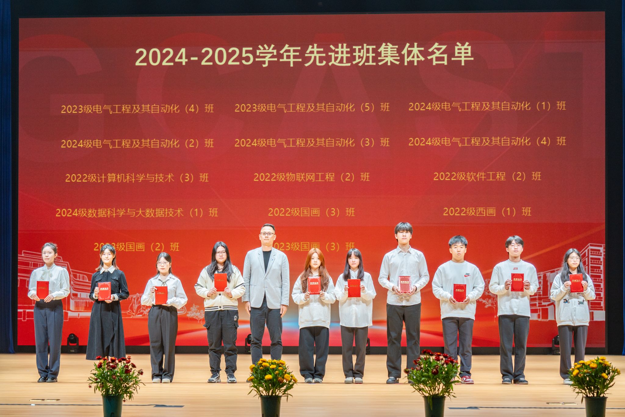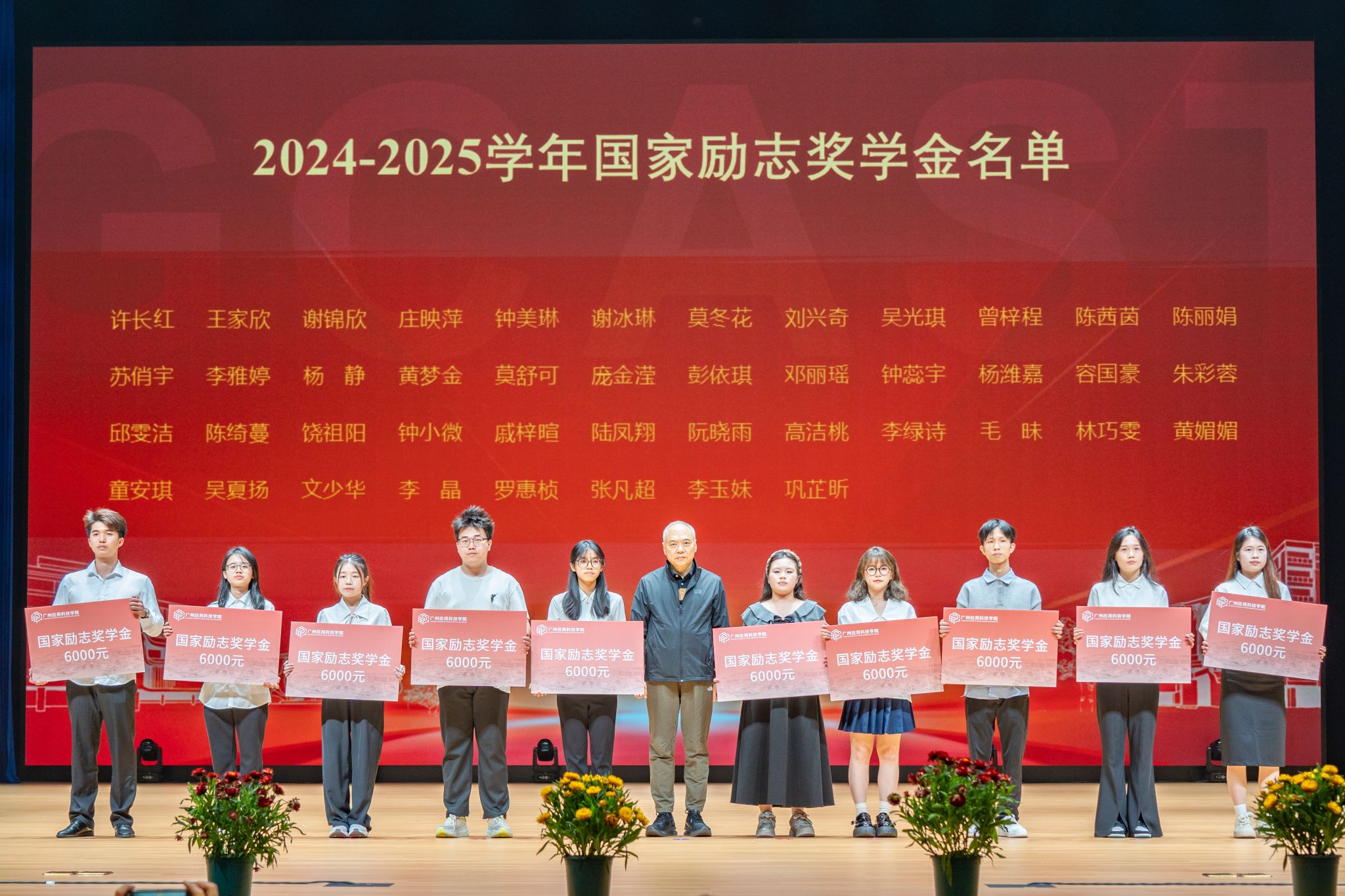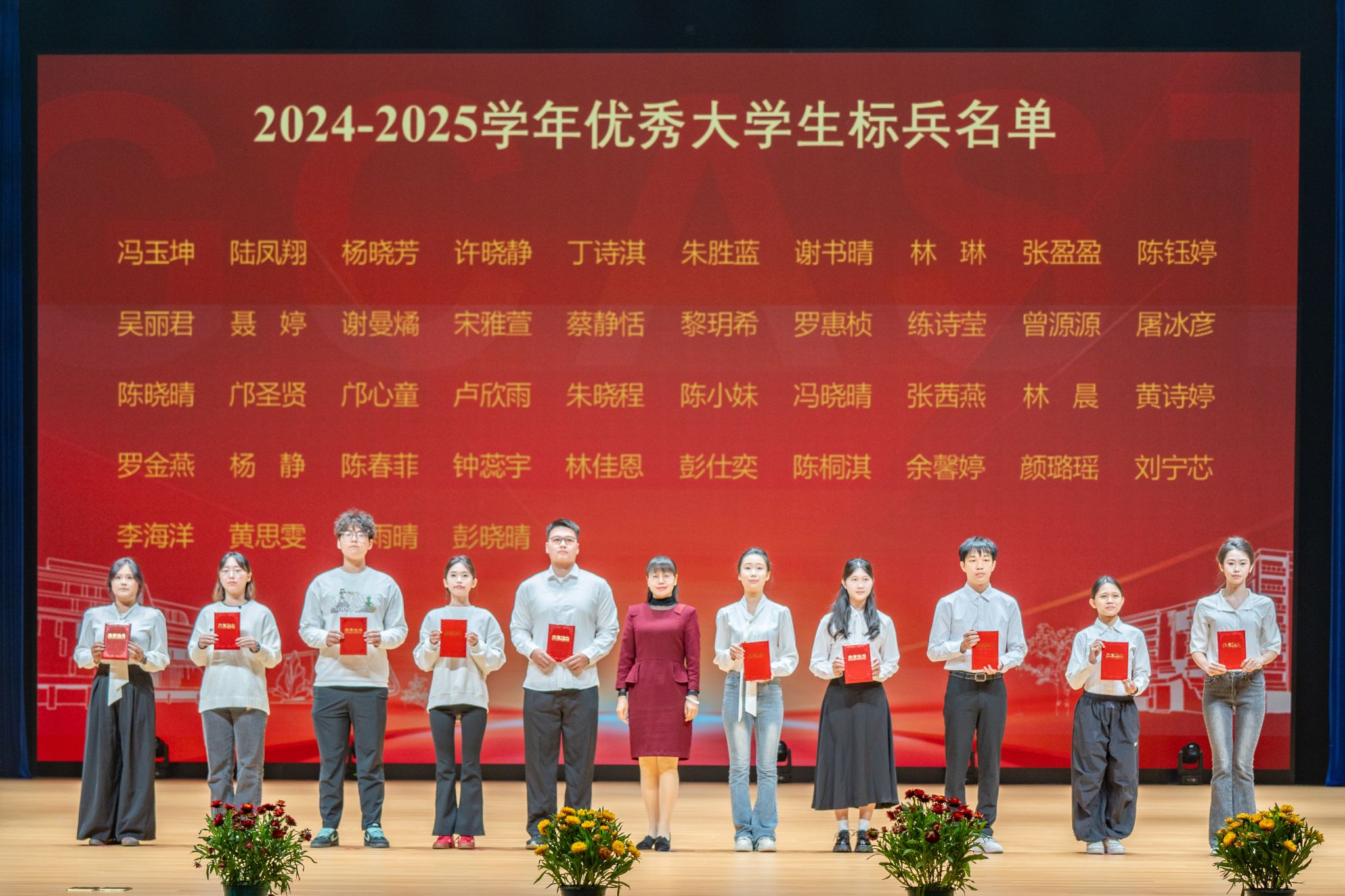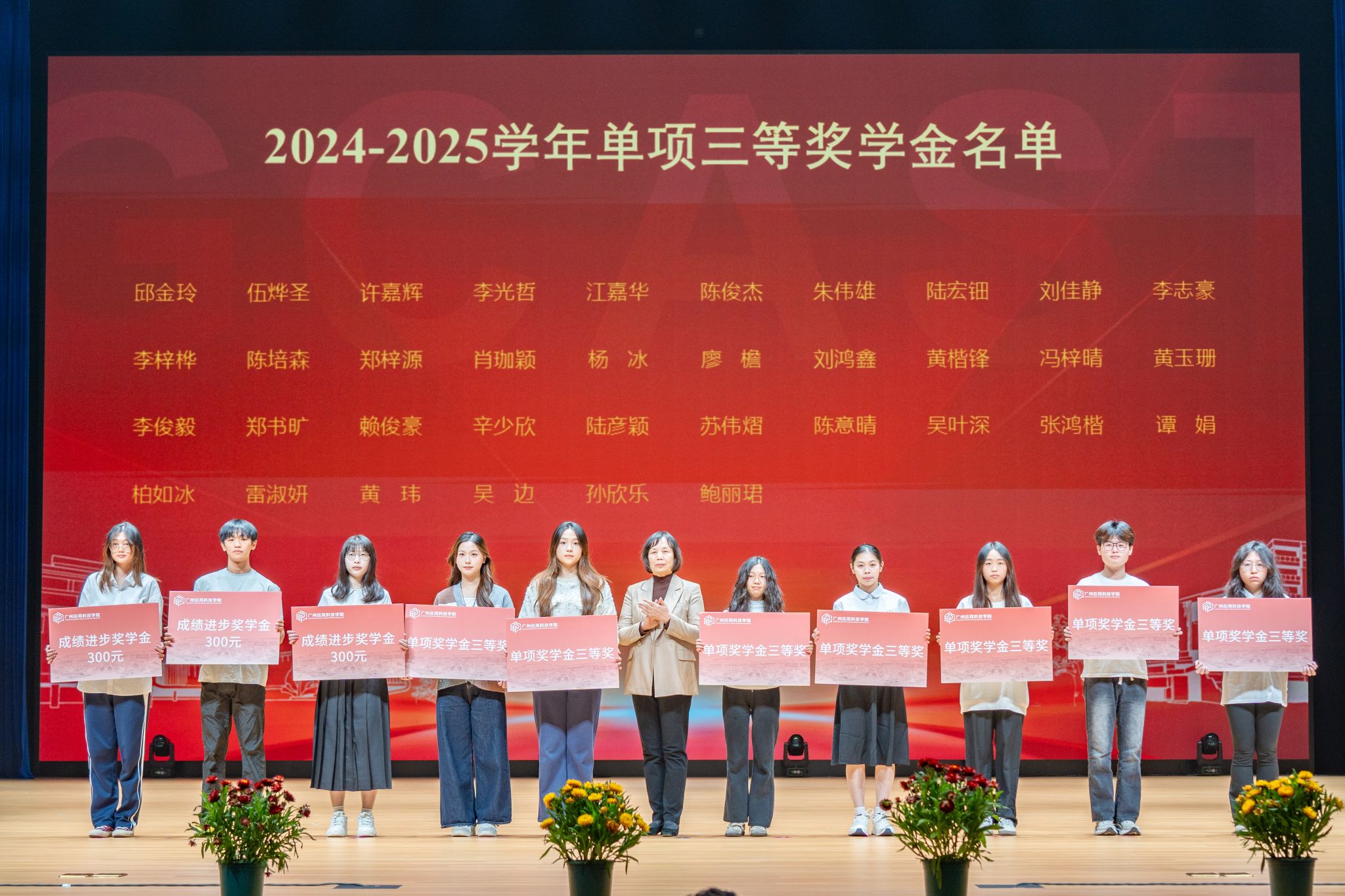 随后,学校党委书记陈光团宣读《广州应用科技学院关于表彰2024-2025学年学生先进个人和先进集体的决定》。为深入学习贯彻党的二十届四中全会和全国教育大会精神,我校始终坚定不移地落实立德树人根本任务,过去一学年,在学风建设、校园文化、社会实践等方面取得了优异成绩,涌现出一批品学兼优的先进个人和先进集体。经广州应用科技学院学生评优评先和奖学金评定工作评审委员会评审通过,报校长办公会审议:钟彩彦等 47 名学生荣获国家奖学金;彭美琪等 1197 名学生荣获国家励志奖学金;林家冰等 84名学生荣获学校一等奖学金;张慧晖等 228 名学生荣获学校二等奖学金;谢驰等 337 名学生荣获学校三等奖学金;王为祥等 3 名学生荣获成绩进步奖学金;梁卓盈等 255 名学生荣获单项奖学金;胡晓敏等 584 名学生荣获“优秀大学生标兵”称号;李洋莉等 1319 名学生荣获“优秀大学生”称号;余宛蓉等 842 名学生荣获“优秀学生干部”称号;陈韵怡等 5 名学生荣获“勤工助学优秀个人”称号;经济与管理学院 2023 级会计学(3)班等 29 个班级荣获“先进班集体”称号;学生公寓 D 座 0332 等 86 间宿舍荣获“最美宿舍”称号。