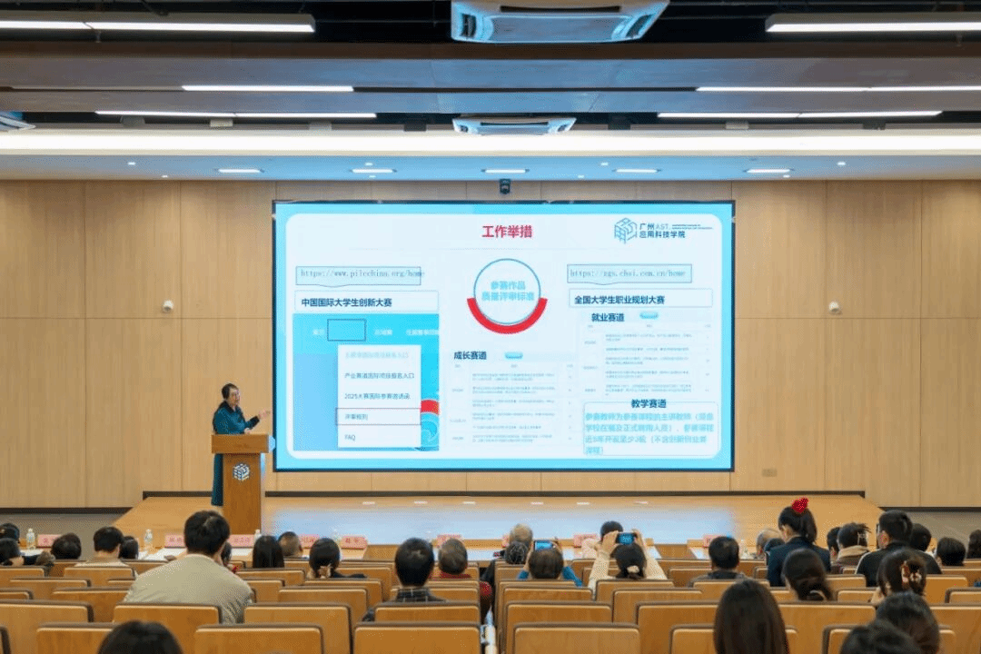 张光宇校长在大会上讲话,对获奖集体和个人表示热烈祝贺,向辛勤耕耘在双创教育一线的师生及企业代表致以诚挚敬意。他指出,过去一年学校立足粤港澳大湾区发展需求,以 “三园融合” 模式为依托,构建了 215 个产教融合基地,通过 “四门 - 四堂 - 四育人” 体系强化双创教育,取得了丰硕成果。针对 2026 年国创赛备战工作,他强调学校将依托 AI 赋能优势,联动华为、科大讯飞等合作企业,为参赛项目提供全方位支持,鼓励全体师生立足专业特色、聚焦社会需求,将创意转化为成果,在国创赛舞台上展现广应科风采。