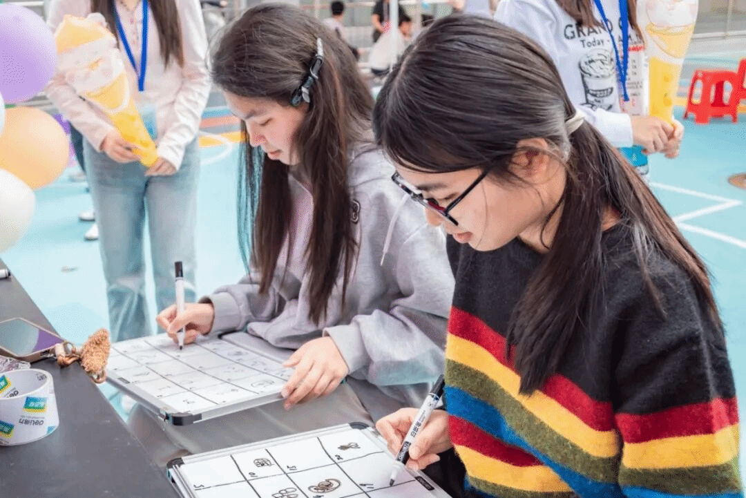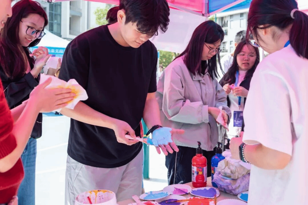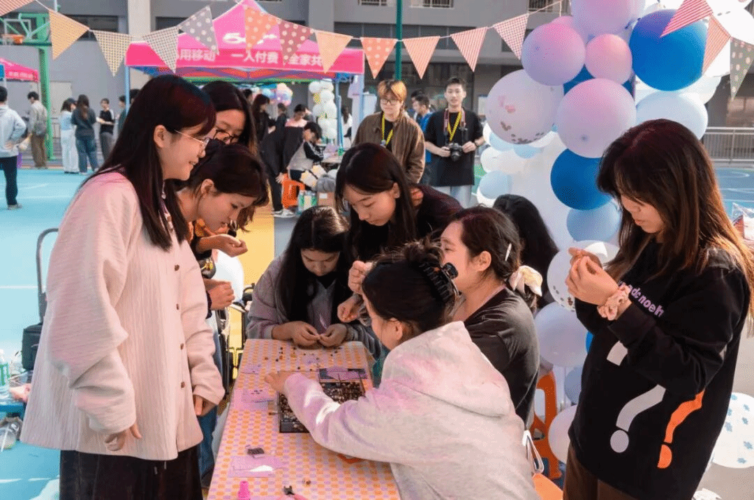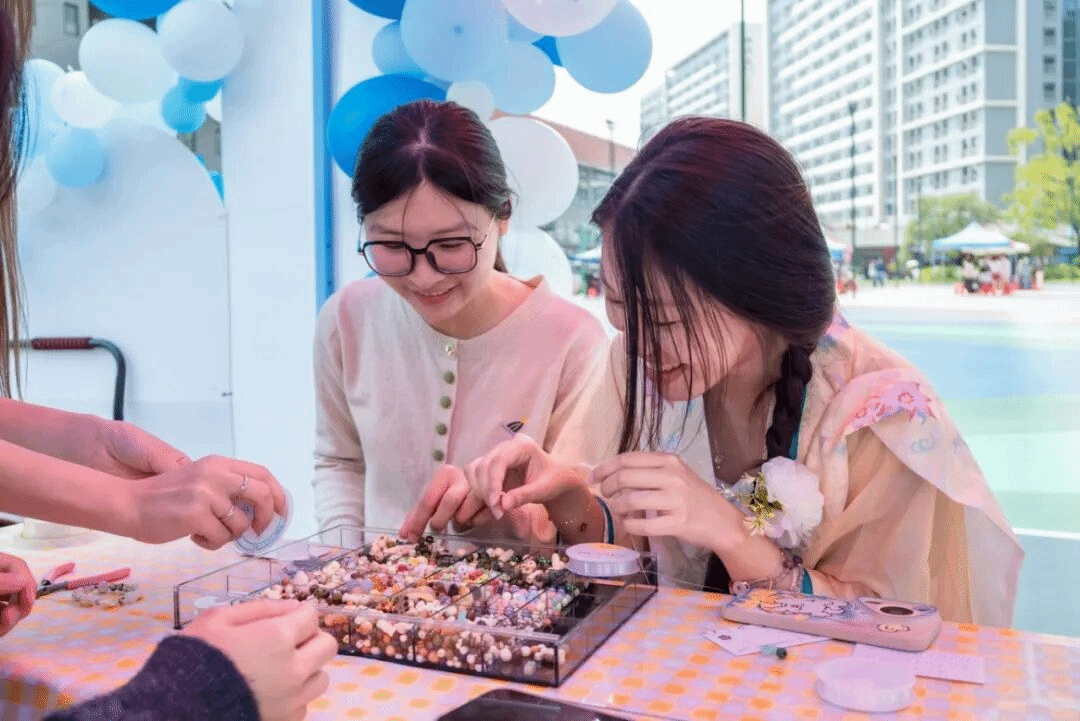 “帮我看看这两个颜色搭不搭?”“你编得好好看,教教我”的对话此起彼伏。DIY创作摊位前热闹非凡,大家围坐桌前,将颗颗彩珠穿入丝线,亲手制作独属于自己的手链,每一件作品都藏着创作者的巧思,现场始终充满专注与欢笑。一颗颗彩珠、一串串手链,不仅是手工创作的成果,更是女生们与彼此、与自己的温柔对话。