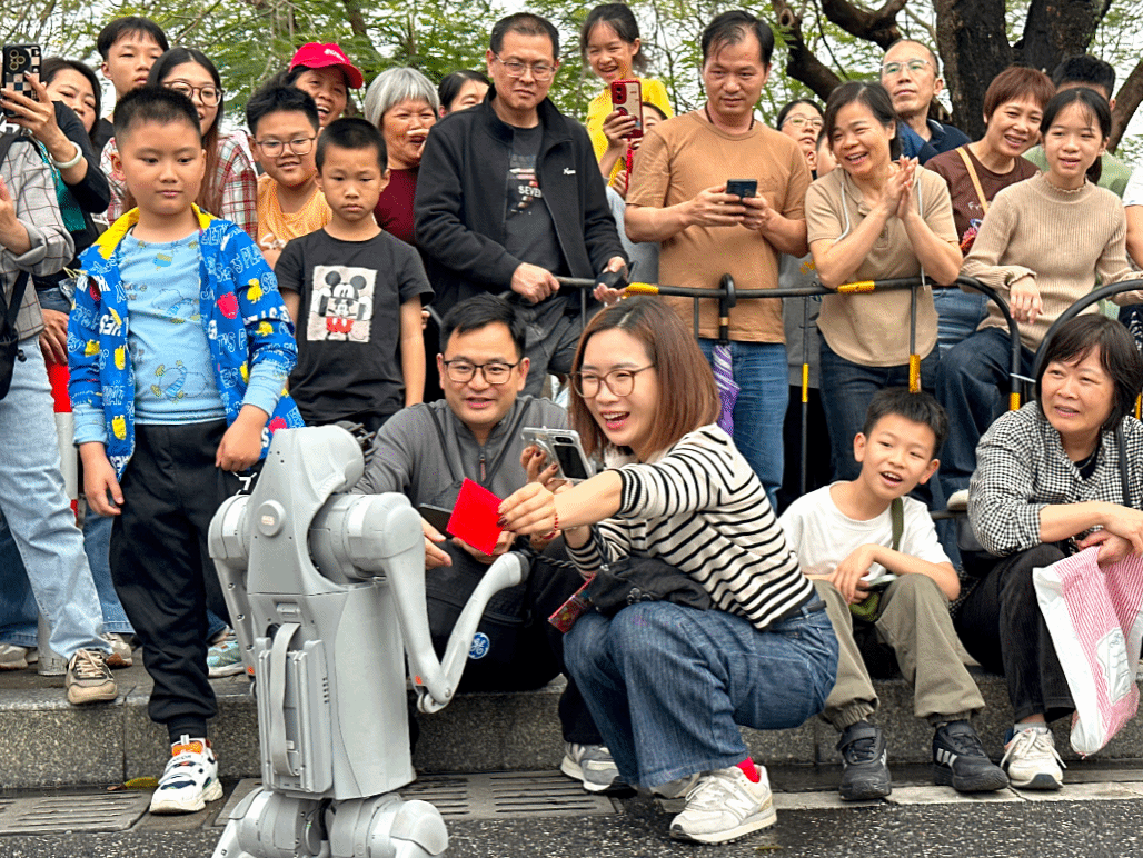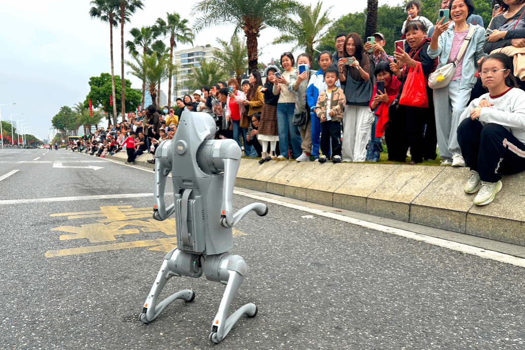 团队带来两大王牌表演阵容,为现场观众献上超震撼的科技视觉盛宴:阿尔法集控机器人舞蹈秀堪称全场焦点,多台阿尔法机器人列队整齐,伴随广府特色乐曲与动感旋律,完成齐步摆臂、旋转跳跃、列队变换等一系列高难度动作,机械关节的精准律动与音乐节奏完美契合,灵动的姿态打破了机械的冰冷感,尽显科技之美;宇树机器狗趣味展演则萌趣十足,身手矫健的机器狗不仅能完成快速奔跑、跳跃翻滚等基础动作,还能配合庙会氛围做出拜年作揖、转圈摇摆等趣味互动动作,憨态可掬的模样与灵活敏捷的身手形成反差萌,更是在3月1日的非遗巡游展演活动现场与观众进行趣味互动,解锁元宵科技新玩法。值得一提的是,学校的阿尔法集控机器人表演团队早已声名远扬,曾惊艳亮相十五运会体操赛事赛场,成为国家级赛场上的“科技明星”。