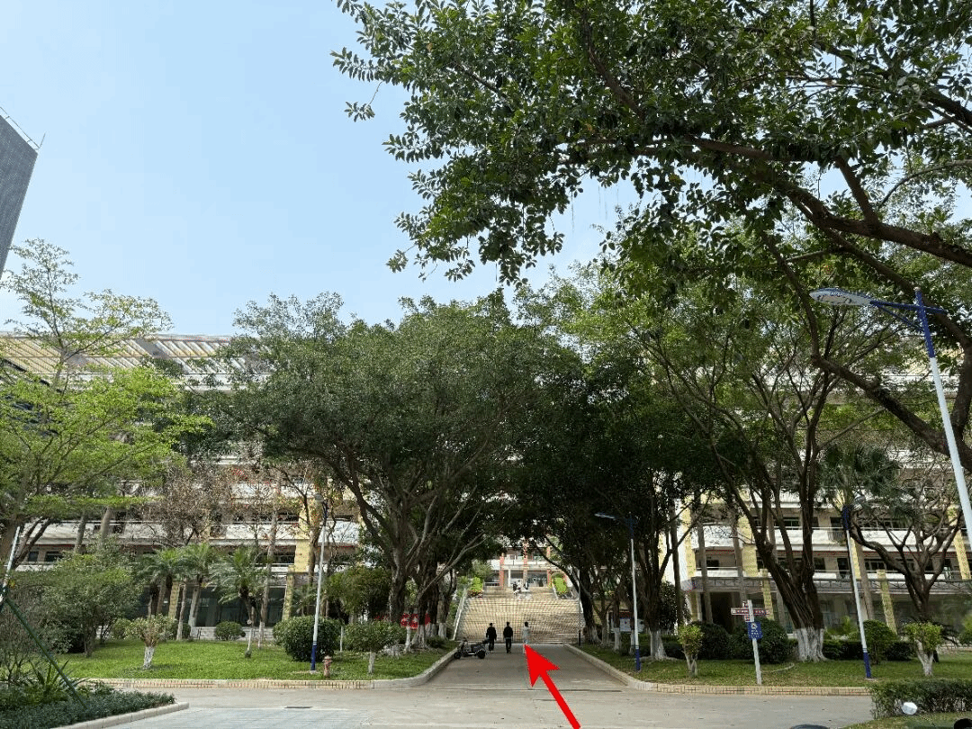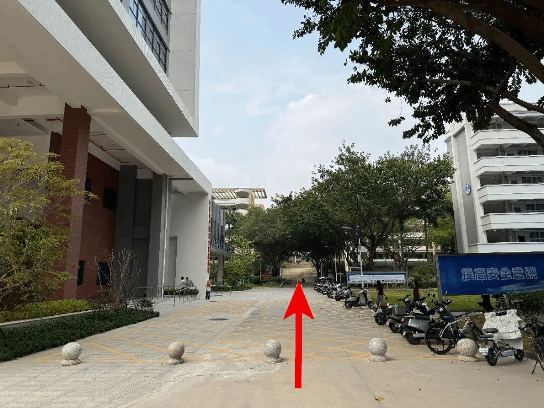 进校后直行,绕花坛环后上坡直行,在第10栋教学楼后沿着中间通道继续前行约40米,即可到达第3栋教学楼。