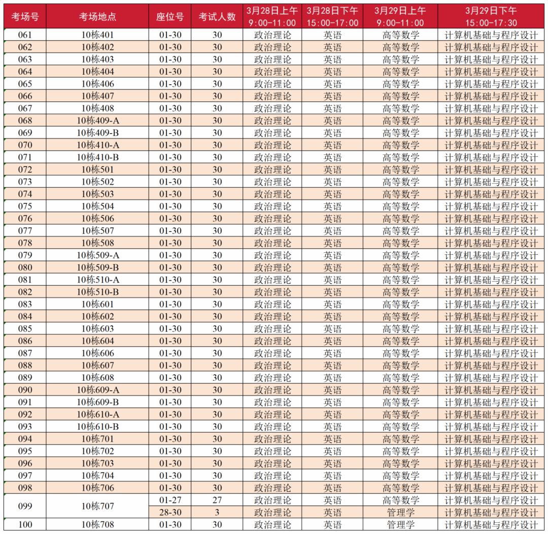 本次考试考场设在第3栋教学楼(001-030考场)、第4栋教学楼(031-060考场)和第10栋教学楼(061-100考场),具体分布如下: