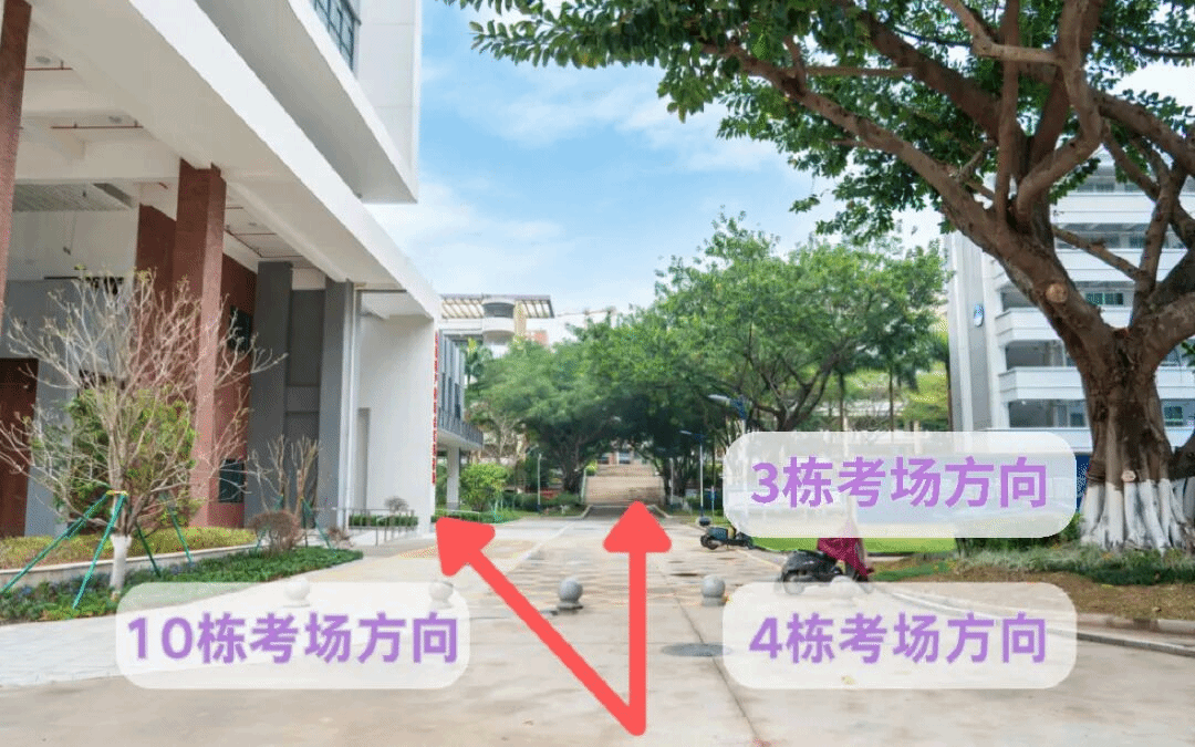 进校后直行,绕花坛环后上坡直行,经过喷水池后即可到达10栋教学楼。从10栋教学楼右侧楼梯上至二楼,到204室存放个人物品(手机、包等)。存放物品后,在二楼封闭区内有序排队进行人脸识别和安检,通过后方可上楼进入考场。