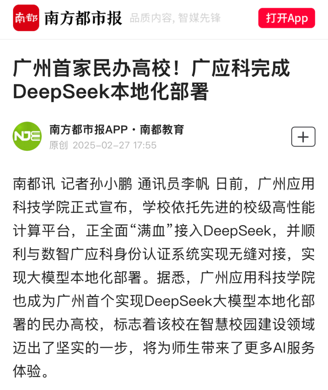 学习强国、中国教育在线、南方+、南方都市报、西江日报等国家、省、市主流媒体,以及广州增城、肇庆新区、肇庆鼎湖区等学校所在地官方发布平台纷纷报道,“广州首家民办高校”“肇庆首家高校”“广州增城首家高校”本地化部署DeepSeeK。