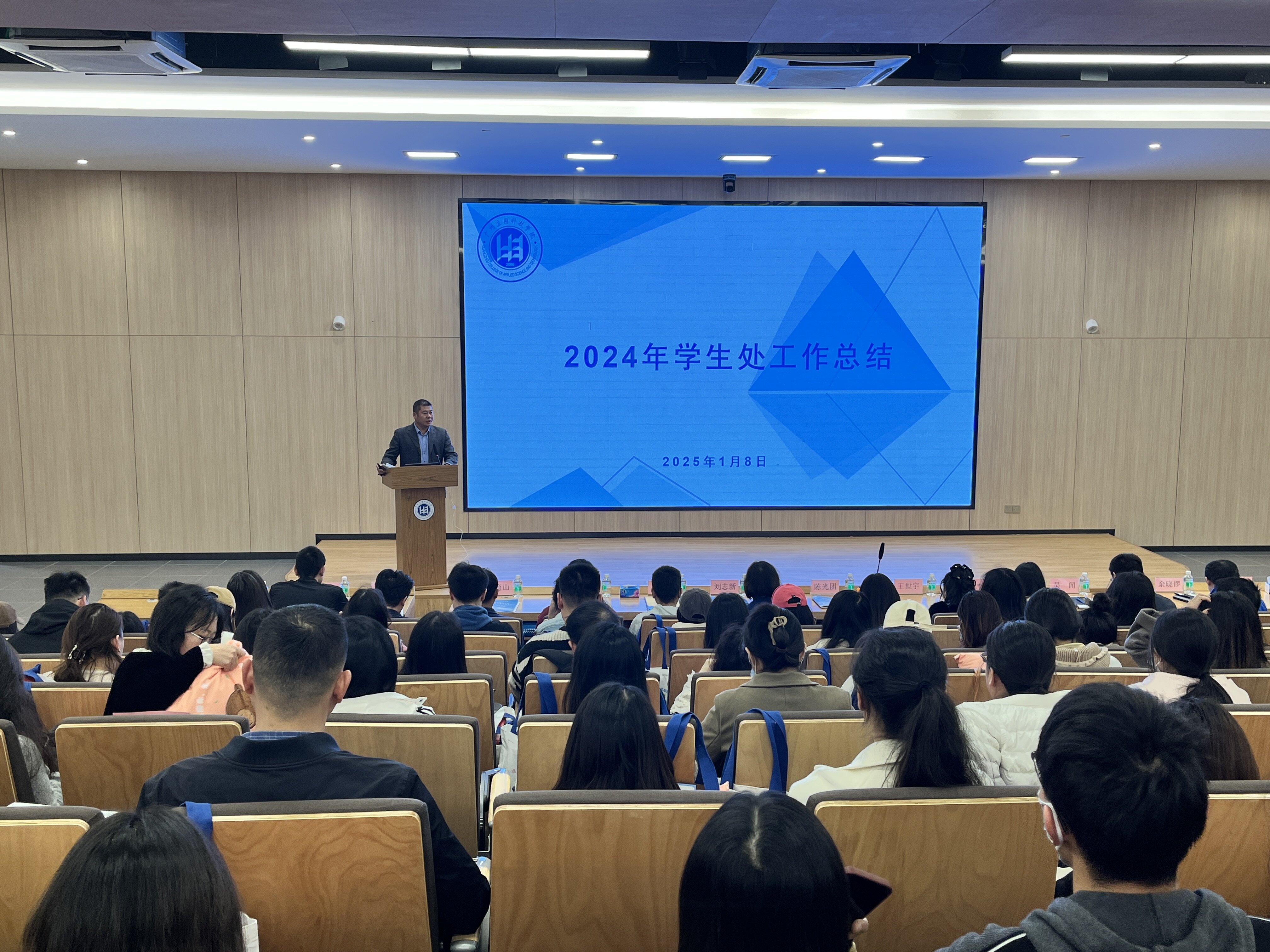 为持续加强学生工作队伍建设,推动学生工作管理水平不断提升,全面总结2024年学生工作成效,促进学生工作队伍学思结合、互学互鉴,党委学生工作部于2025年1月8日在肇庆校区图书馆1楼报告厅召开了2024年学生管理工作总结大会。校领导,党委学生工作部、校团委、就业指导中心、心理健康教育中心全体人员,各二级学院分管学生工作负责人,全体辅导员,各二级学院就业干事参加此次大会。