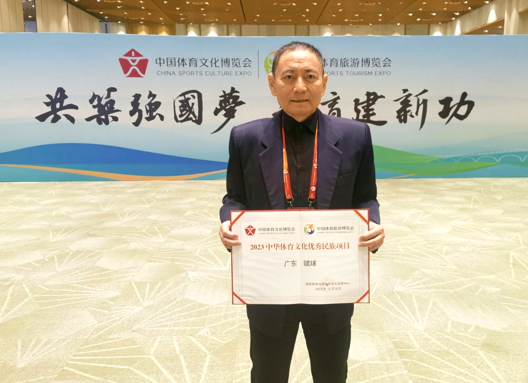 12月8日,2023中国体育文化博览会、中国体育旅游博览会(以下简称“两个博览会”)在美丽的大运河畔——苏州市隆重开幕。2023中华体育文化优秀项目颁奖仪式,也在当天的“两个博览会”开幕式现场举行。国家体育总局体育文化发展中心发布入选“2023中华体育文化优秀项目”名单,广东的毽球项目入选“2023中华体育文化优秀民族项目”,这也是广东唯一一个项目入选此次的体育文化优秀民族项目。应组委会邀请,广东省毽球运动协会常务会长、广州应用科技学院体育科技学院院长张军教授出席活动,代表广东省领取了中华体育文化优秀民族项目奖项。广州应用科技学院作为广东省毽球运动协会会长单位,也是广东省毽球运动训练基地,将全力传承毽球这项中华传统民族体育项目的发扬光大。