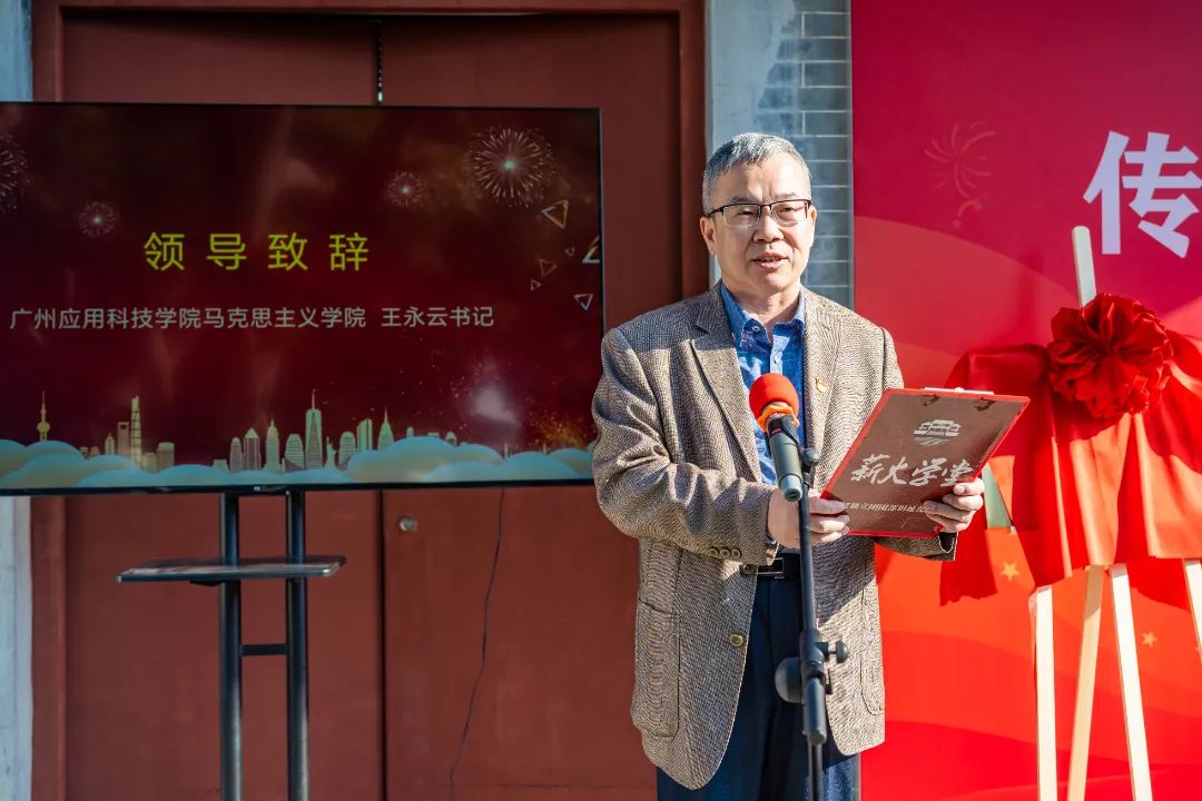 学校党委书记王永云在揭牌仪式上致辞。他首先我代表广州应用科技学院党政领导班子向学校马克思主义学院与叶挺独立团团部旧址纪念馆合作共建表示热烈的祝贺,向纪念馆对我校教育教学工作的支持和信任表示感谢。王永云书记表示,校馆通过共建实践教学基地,将充分发挥叶挺独立团团部旧址纪念馆的红色文化资源优势和我校马克思主义学院的学科优势,共同开发具有针对性和实效性的思想政治教育教学课程和实践活动,探索出一条具有广应科特色的思想政治教育实践教学之路。他希望学校师生通过走进红色基地,深入了解叶挺独立团的光辉历史,进一步弘扬叶挺独立团的“铁军精神”,把理论学习小课堂和社会大课堂结合起来,共同推进大学生思想政治教育工作,为培养德智体美劳全面发展的的社会主义建设者和接班人贡献力量。