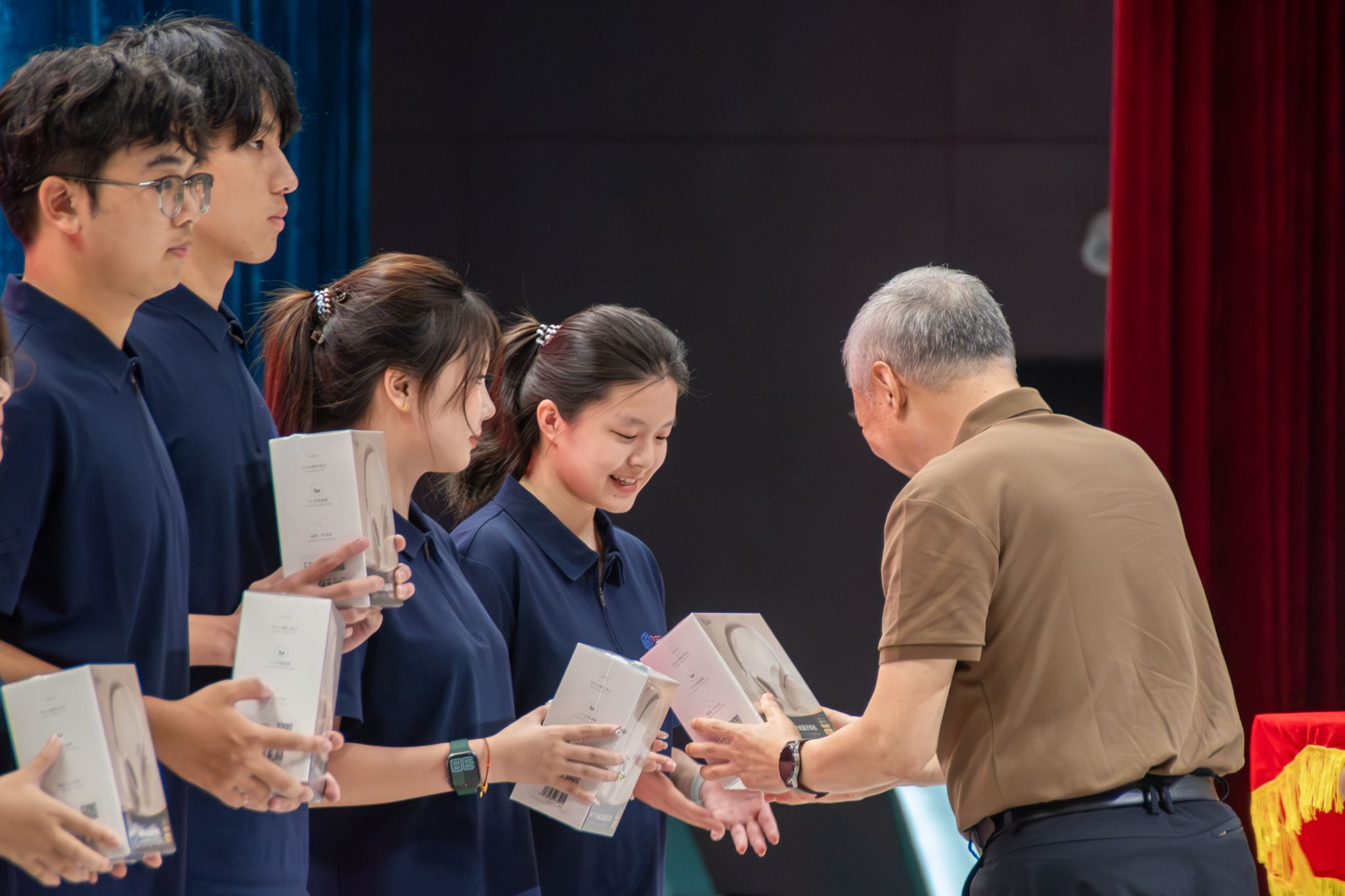 在庄重的颁奖环节,校领导及相关学院负责人分别为获奖学生颁奖。张光宇校长代表学校为国际教育学院2025级新生赠送了定制耳机作为入学纪念,传递学校的关怀与期待。