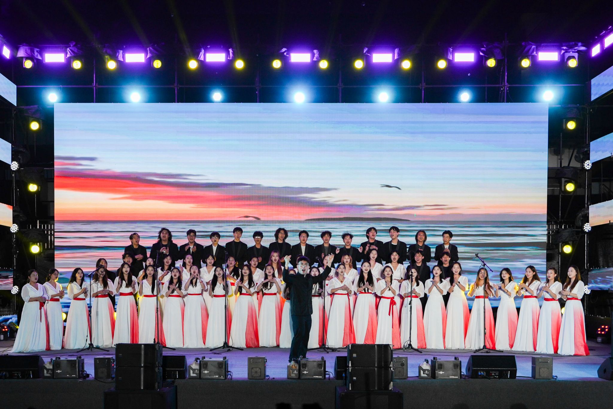 当《海阔天空》的经典旋律响起,全场新生自发齐声合唱。挥舞的荧光棒汇成一片摇曳的星河,点点光芒映照着一张张朝气蓬勃的脸庞,空气中涌动着青春的热浪,将现场气氛推向温暖的高潮。这动人的一幕,恰似“莲花大陆”为新生们徐徐铺展的未来画卷,歌声中饱含着对他们未来“闯关”之路的无限期许与磅礴力量。