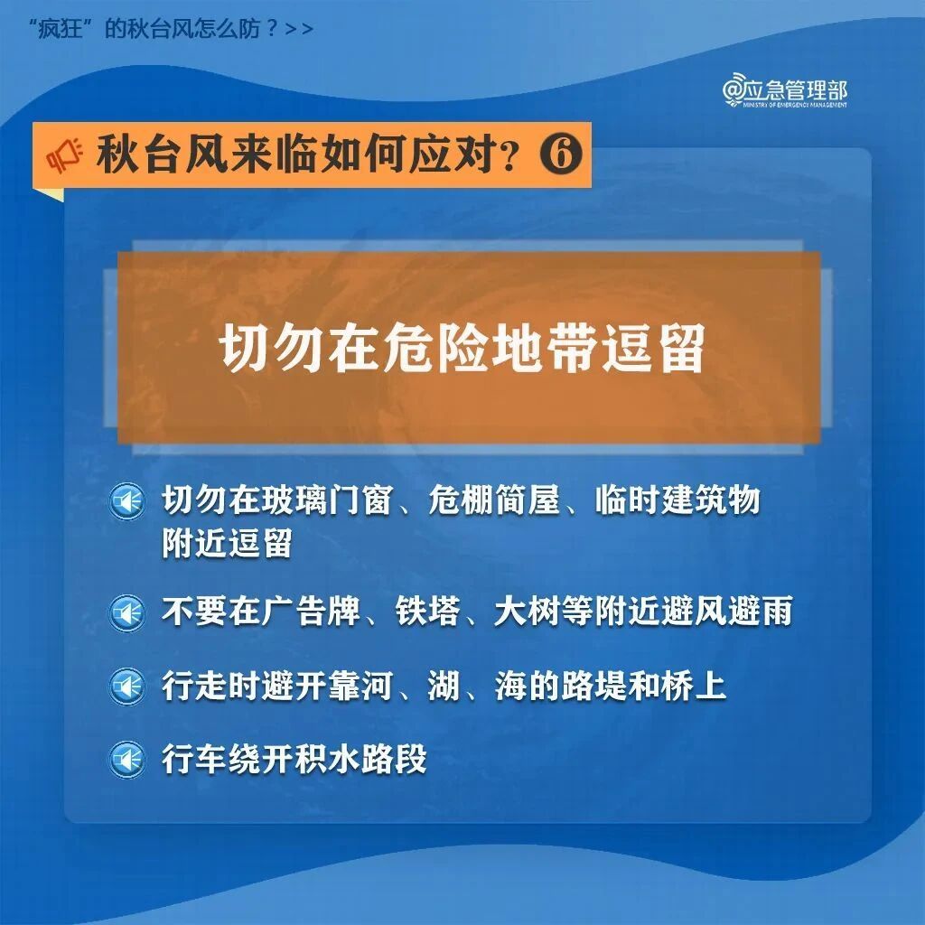 广大师生员工要强化自我防范意识,密切关注台风动向,受台风及强降雨影响期间,尽可能留在室内,减少户外活动,关好门窗,阳台盆栽或室外悬挂物请及时移到室内或进行加固。提前准备相应的应急物资,如饮用水、方便食品、常用药品、手电筒和充电宝等,以应对可能出现的突发情况。外出注意树木折断及其他坠物危险,不在施工工地、围蔽墙旁边逗留,避免涉水行走或驾车在积水地段行驶,不在大树下和电线杆旁避雨,不前往楼顶或接近导电性高的物体。请勿将车辆停放在大树下或低洼处,以免大风刮断树枝砸坏车辆或因暴雨积水导致车辆受损。