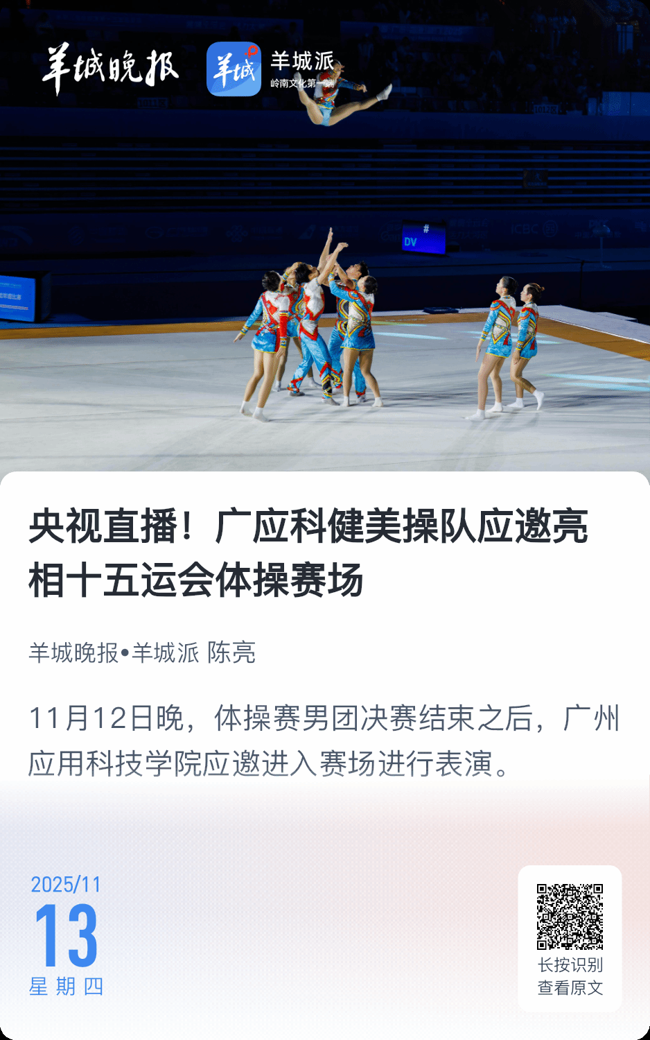近日,中华人民共和国第十五届运动会体操成年组赛事在广东肇庆拉开帷幕。11月12日晚,在体操赛男团决赛结束之后,广州应用科技学院应邀进入赛场进行表演,来自广应科健美操队8名队员演绎的有氧舞蹈《七彩跃动》在十五运会体操决赛赛场亮相。演出也通过中央电视台“央视频”现场直播,通过同期声现场播报,向全国观众展现了广应科学子的青春风采与大湾区青年的精神风貌。