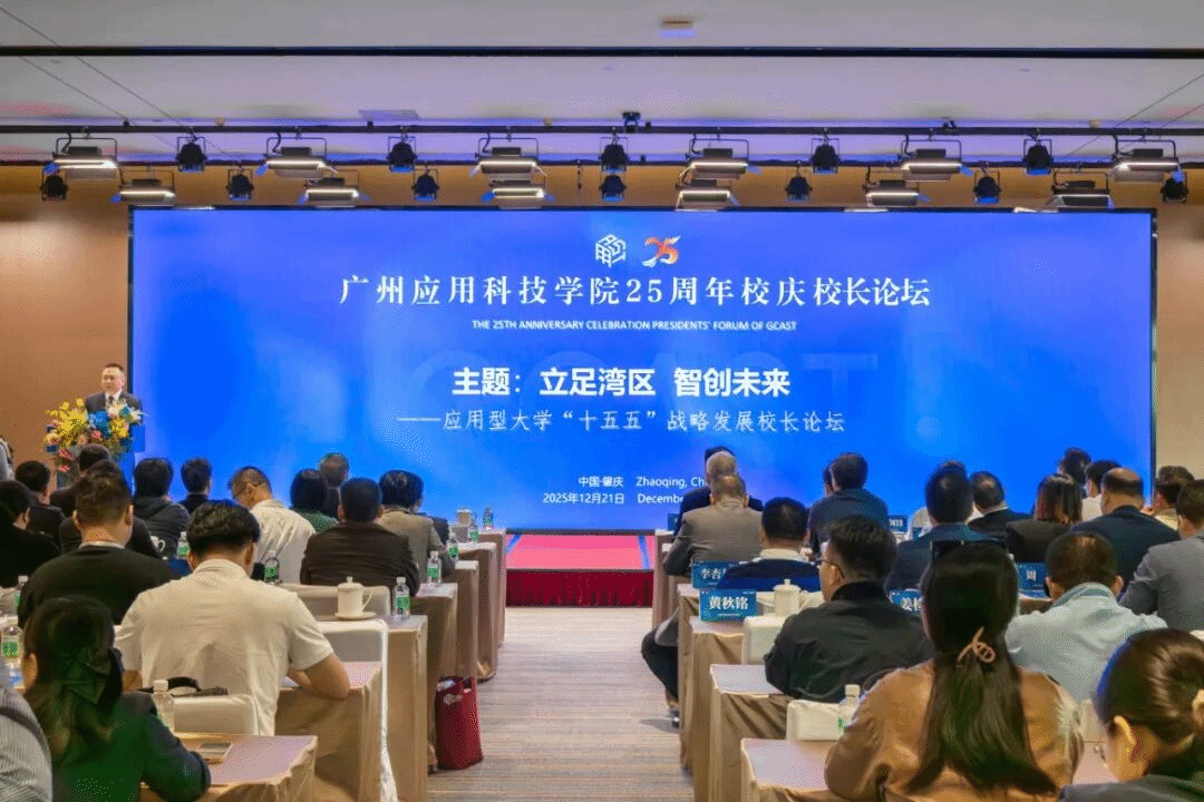 冬至暖阳,硕果盈枝。2025年12月21日,广州应用科技学院25周年校庆校长论坛在肇庆校区国际会议中心隆重举行。本次论坛以“立足湾区 智创未来——应用型大学‘十五五’战略发展”为主题,200多名深耕高等教育领域的省内外高校领导、专家学者和企业界精英汇聚一堂,共同探讨应用型大学高质量发展新路径,共绘新质人才培养新蓝图。学校全体校领导、中层干部和教师代表参加论坛。论坛由学校常务副校长吴舸主持。
