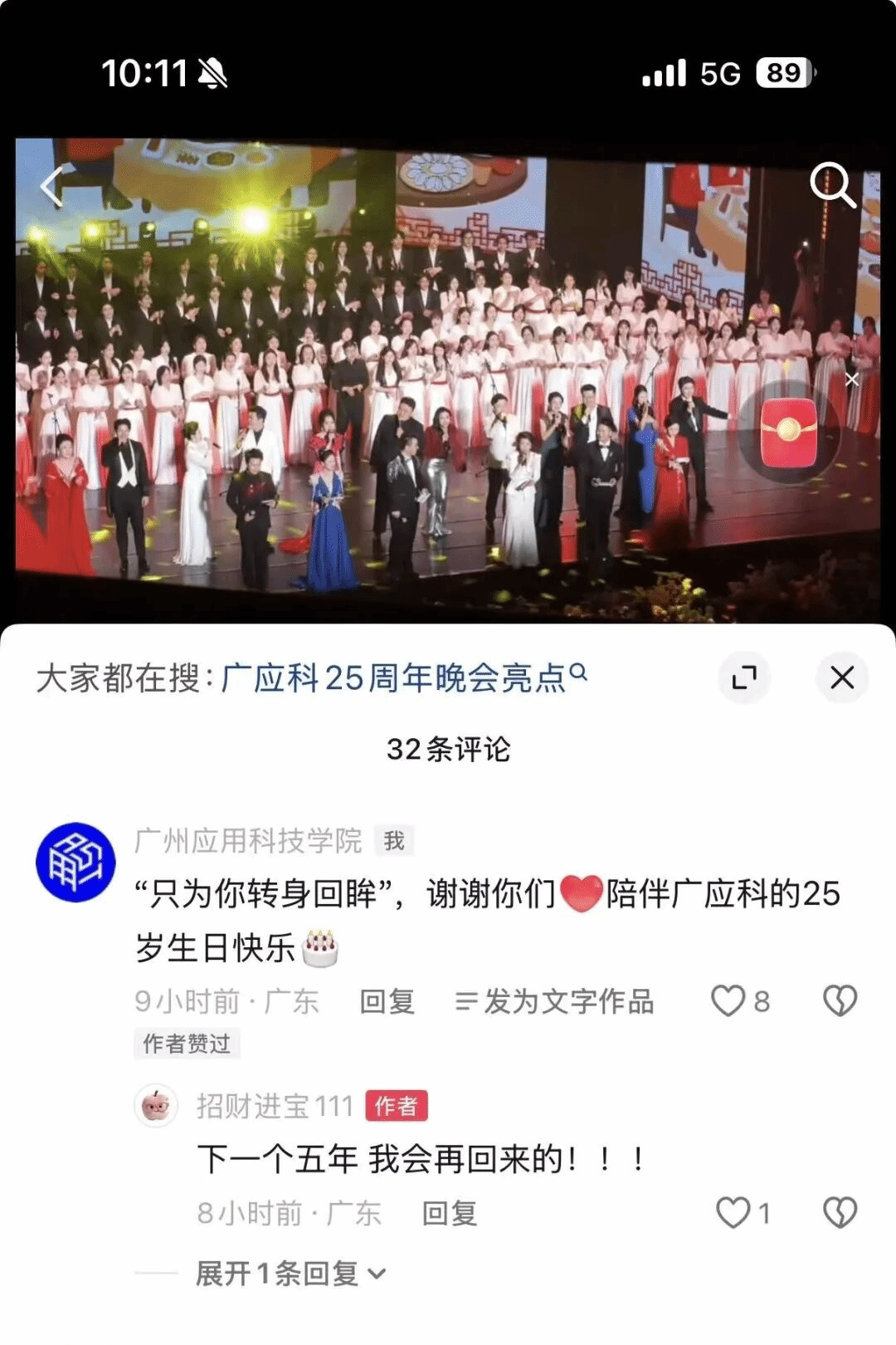 “广应科幸福的群像”“这是一场广应科‘春晚’”“母校生日快乐”在抖音、小红书、视频号等社媒平台,师生和校友@广州应用科技学院,把这场校庆晚会刷屏。