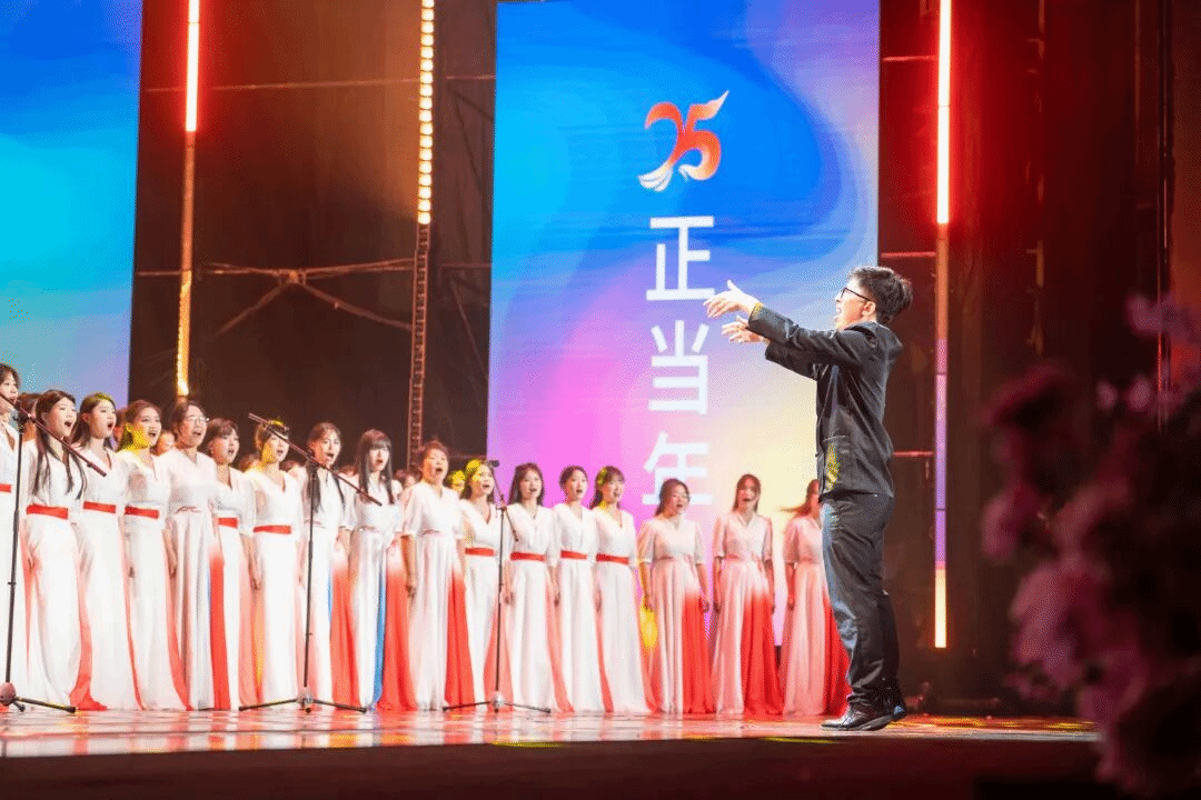 音乐学院呈上流行联唱《不同凡响》,曲风多元,以青春旋律展现广应科学子的昂扬风貌;教职工合唱团、校合唱团、音乐学院合唱团师生代表共同献演校庆主题歌《适者大成》《祖国颂》,歌声嘹亮,以赤诚之心抒发爱校报国的深厚情怀。