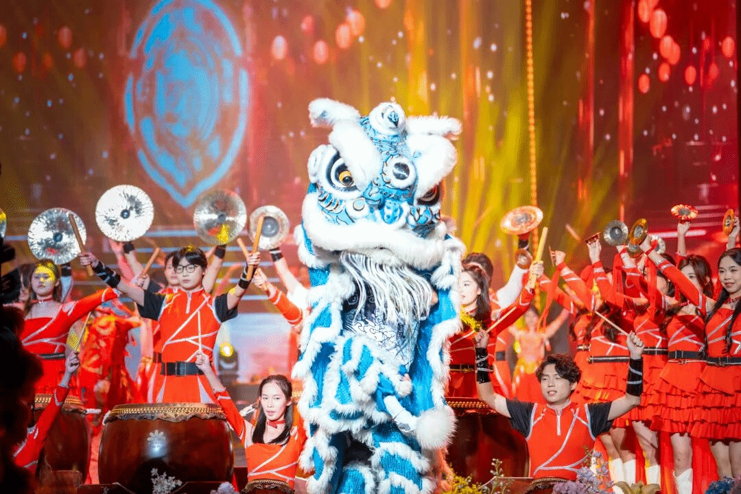 庆典晚会以非遗表演《鼓舞龙腾》震撼开场,由音乐学院学生代表与龙狮协会、英歌舞协会共同演绎,铿锵鼓点激昂澎湃,灵动舞姿气势如虹,不仅彰显中华优秀传统文化的厚重底蕴,更以雄浑气魄奏响校庆序曲。