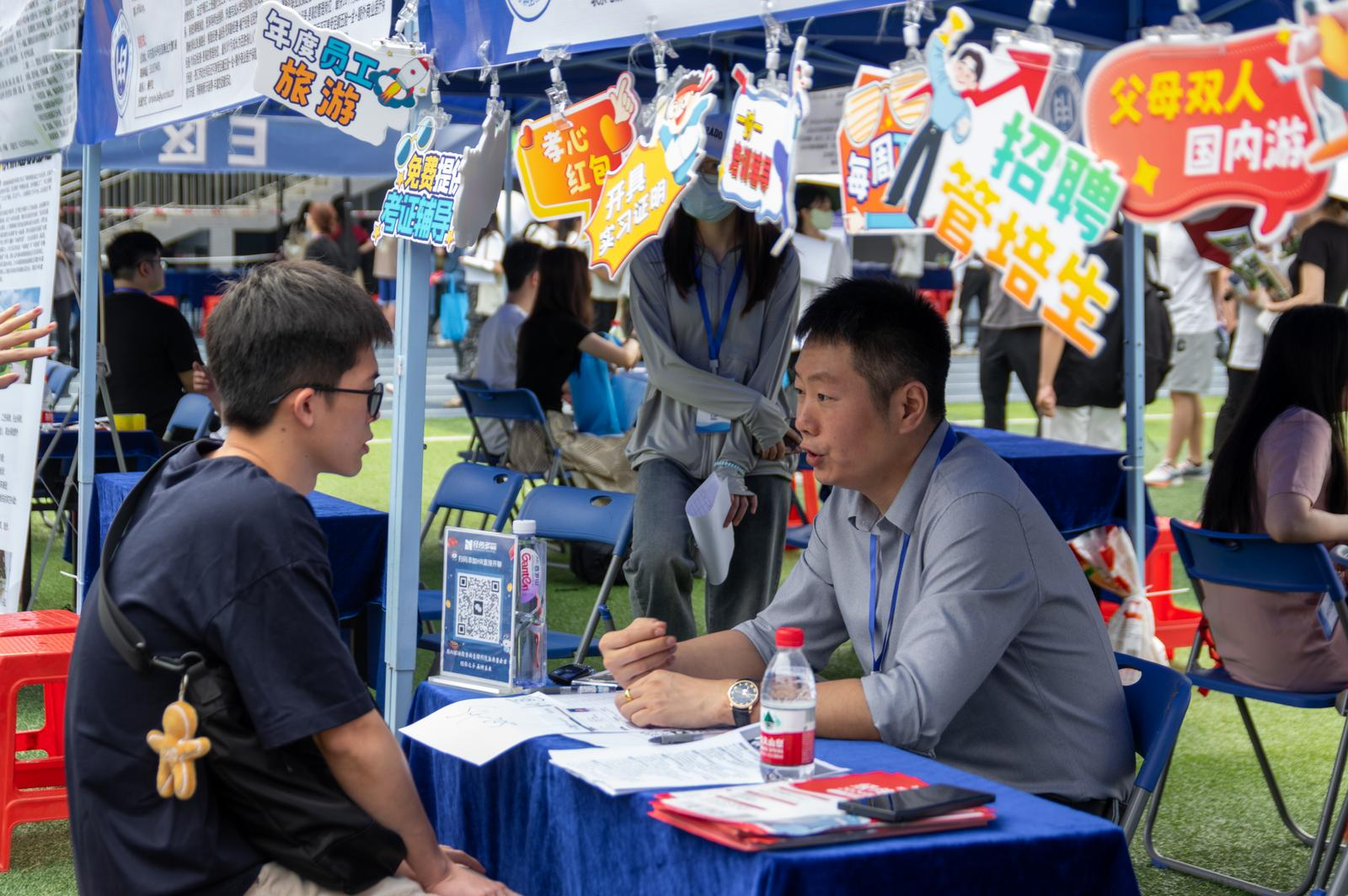 记者观察发现,现场企业开出的薪资多在6k左右,而一家数字科技公司的薪资达到了8k-12k。原来是招聘有娱乐直播经验的视频平台才艺主播3人,还提供旅游团建和生日福利等待遇。据悉,广应科有播音与主持、广告学、新闻学等专业与该岗位相适配。此外,一家文体公司抛出20k的“高薪”招聘网球教练,这是当天现场薪资最高的岗位,摊位前十分火爆。