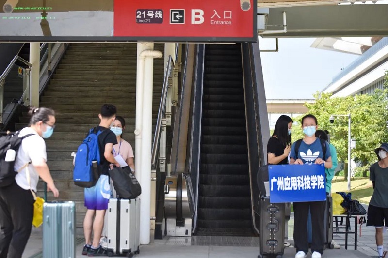 我校为迎接新生及家长快速到校在山田地铁站D出口设置迎新点,高高举起的蓝白款广应科迎新牌让新生一眼就能精准定位广应科。