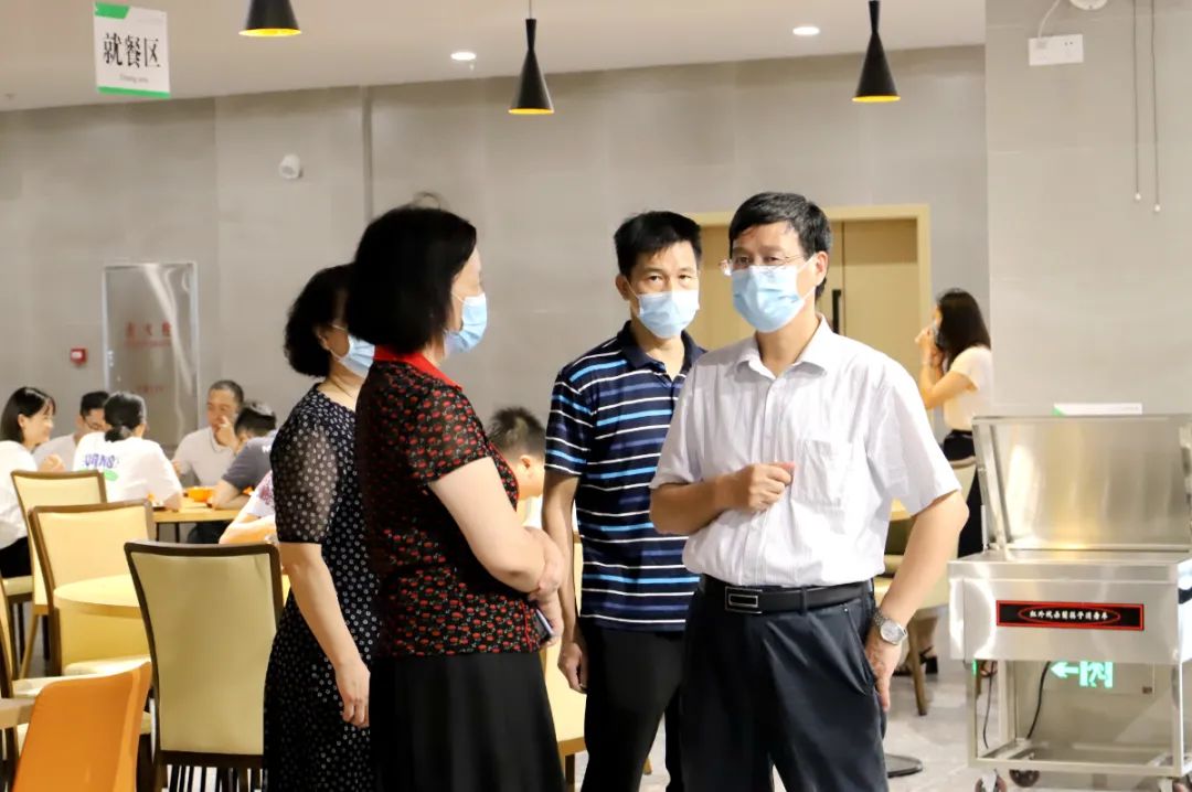 中午12点,当同学们结束上午的课程陆续回到北区的食堂用餐,学校董事长、校长刘剑锋,副校长刘志新等校领导也分别来到校园食堂,检查食堂疫情防控工作和卫生保障,并且和同学们一起打饭用餐。