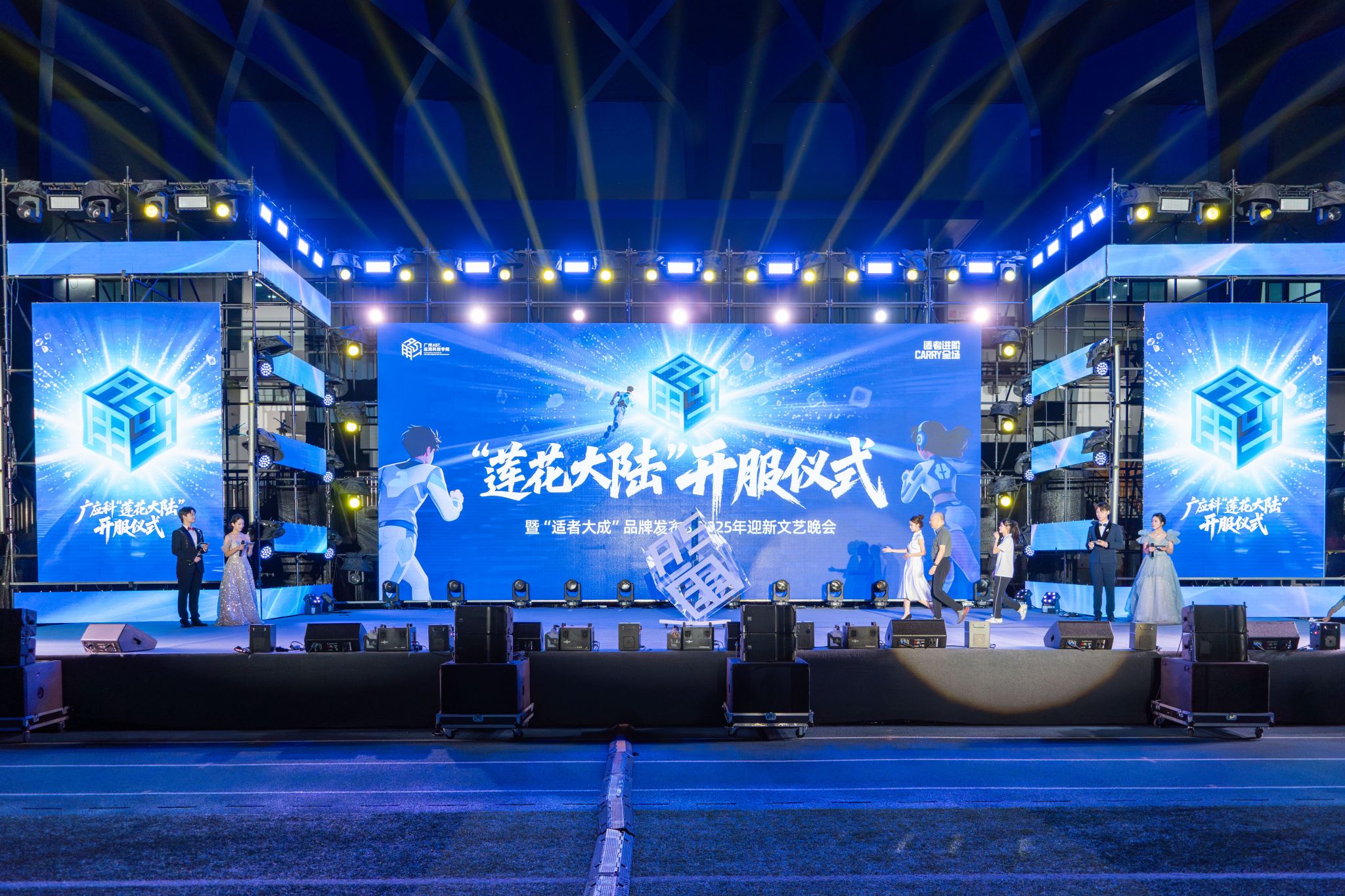 2025年9月22日晚,广州应用科技学院足球场迎来一场别开生面的晚会——“莲花大陆”开服仪式暨“适者大成”品牌发布及2025级新生文艺晚会。在科技感与青春气交融的氛围中,全体2025级新生以“玩家”身份正式登陆“莲花大陆”,开启大学阶段的专属成长旅程。