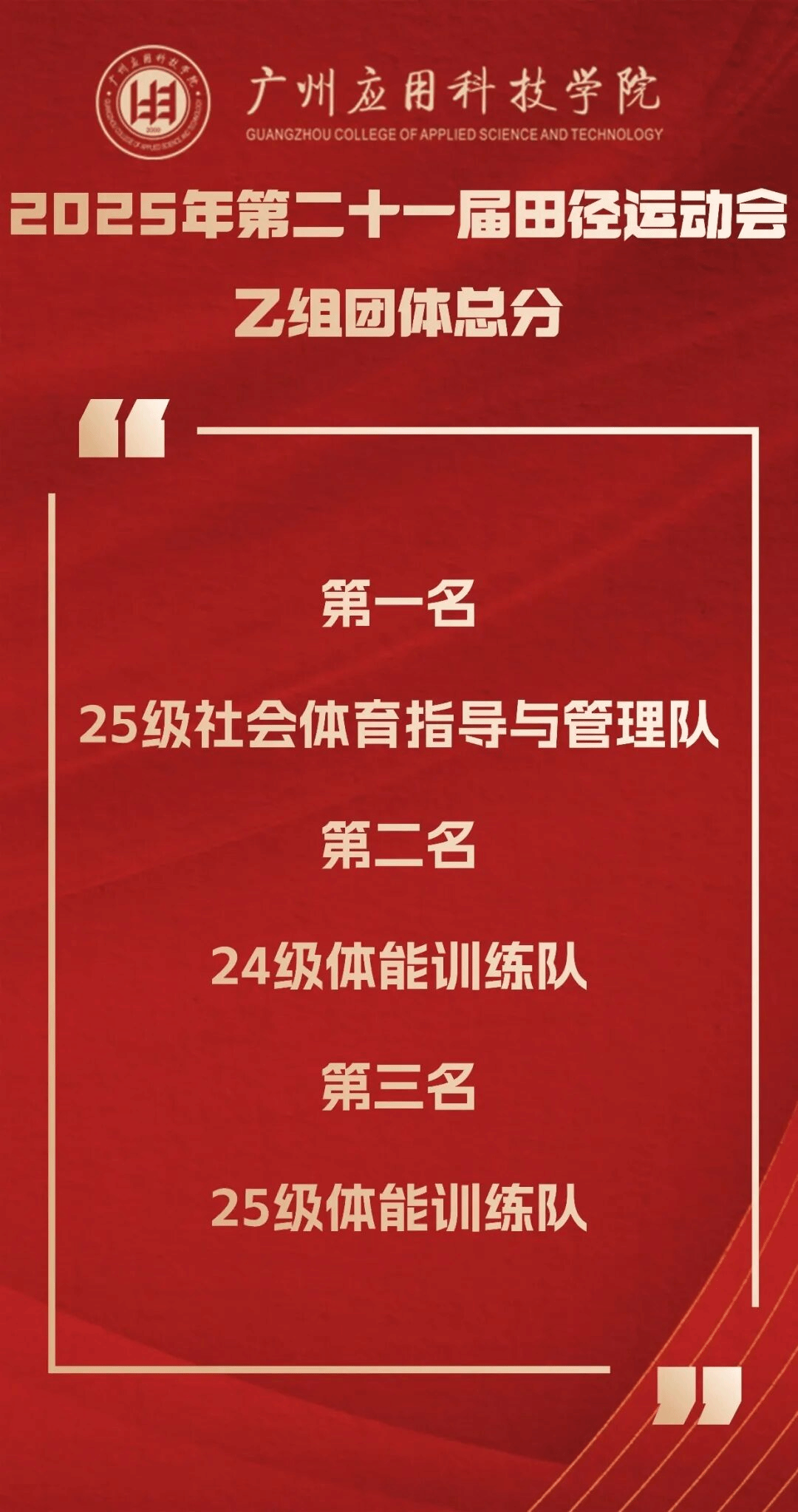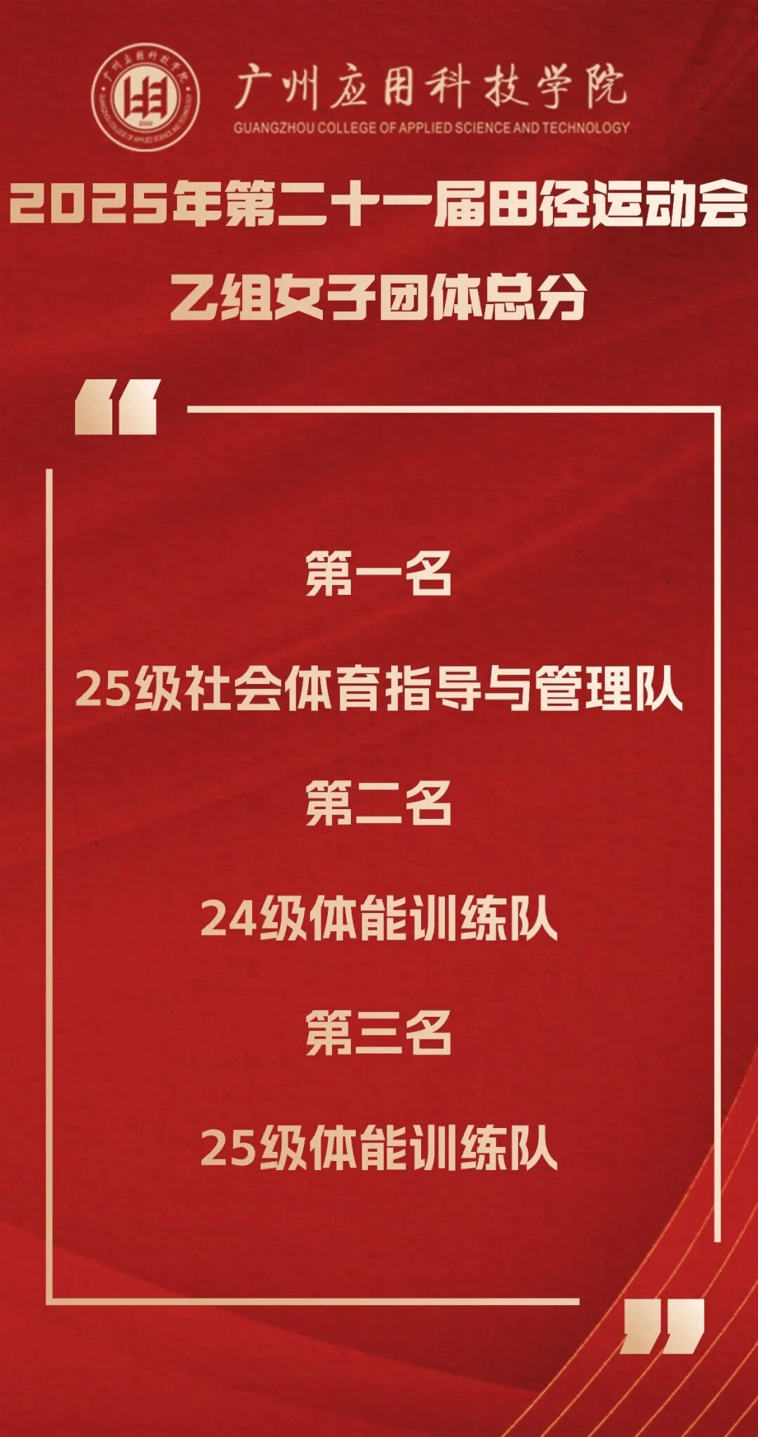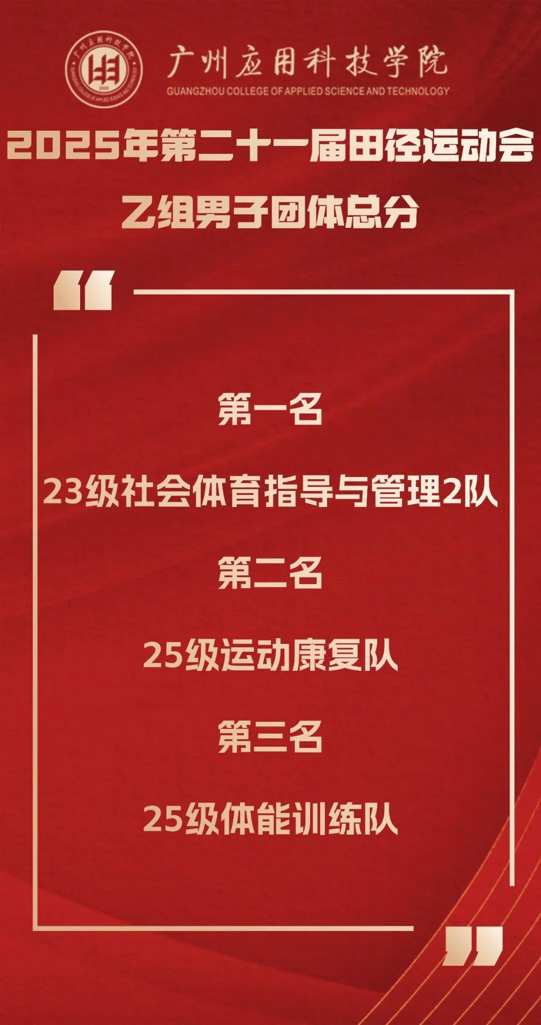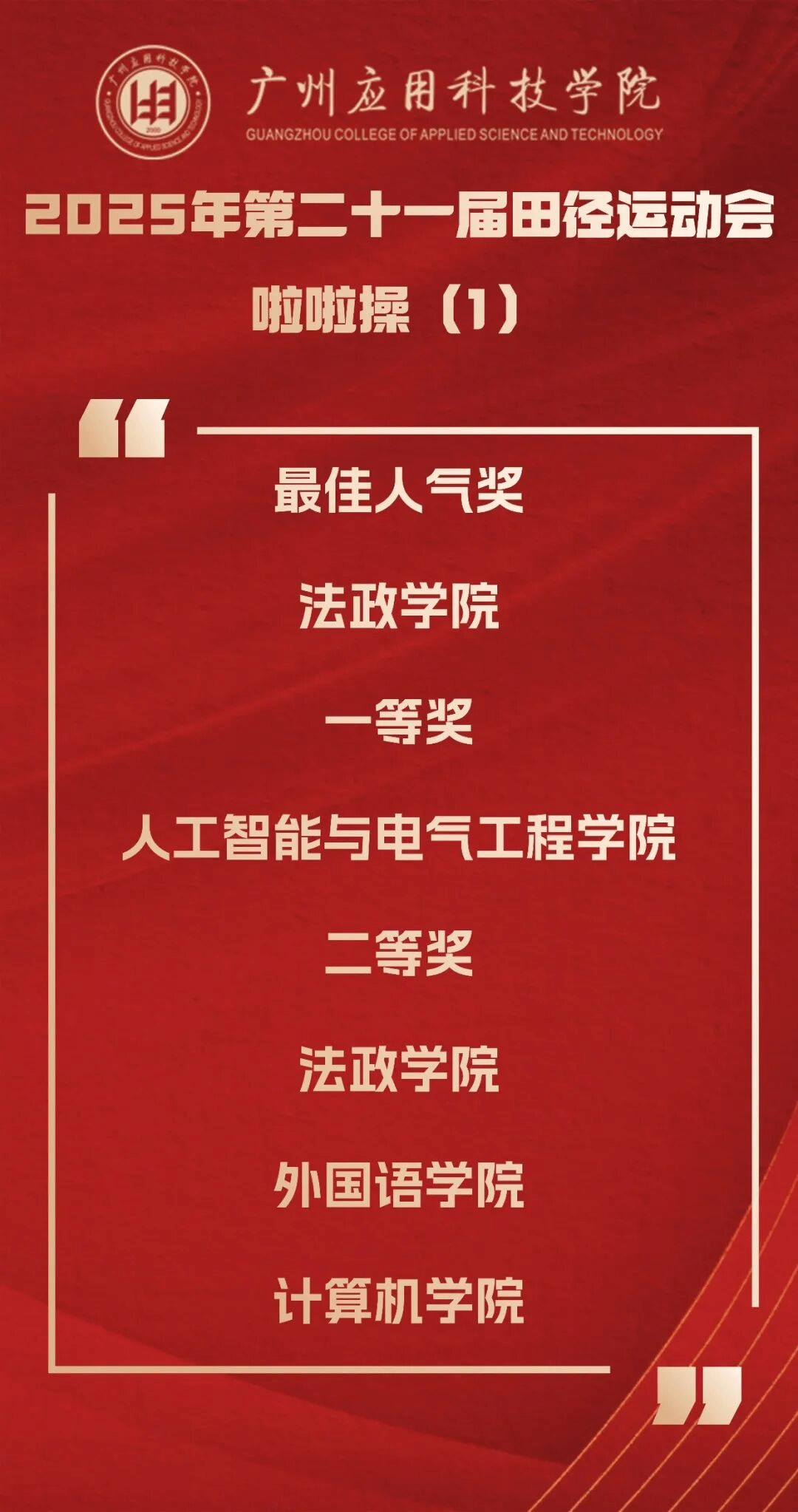 正当年!在校庆25周年的特殊节点,第21届校运会的帷幕已然落下,但拼搏进取、团结协作的体育精神已在校园深深扎根。本届运动会的成功举办,是广州应用科技学院“体教融合”结出的硕果,是“体育强校”建设迈出的坚实一步,更是学校落实“五育并举”、构建高水平育人体系的生动写照。它启示我们,健全的人格寓于健康的体魄,教育的真谛在于全面发展的追求。展望未来,全体广应科人必将承载着赛场上的激情与荣耀,将顽强拼搏之志、团结协作之风融入日常学习工作,持续践行“适者大成”的核心品牌理念,凝聚起推动学校高质量内涵式发展的磅礴力量,在新时代的征程上共同谱写更加绚烂的华章。