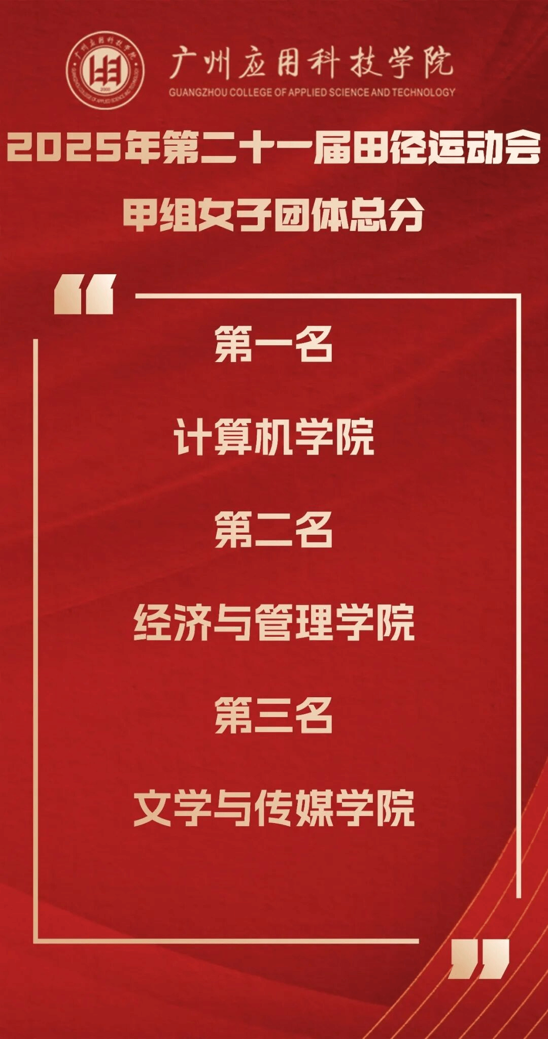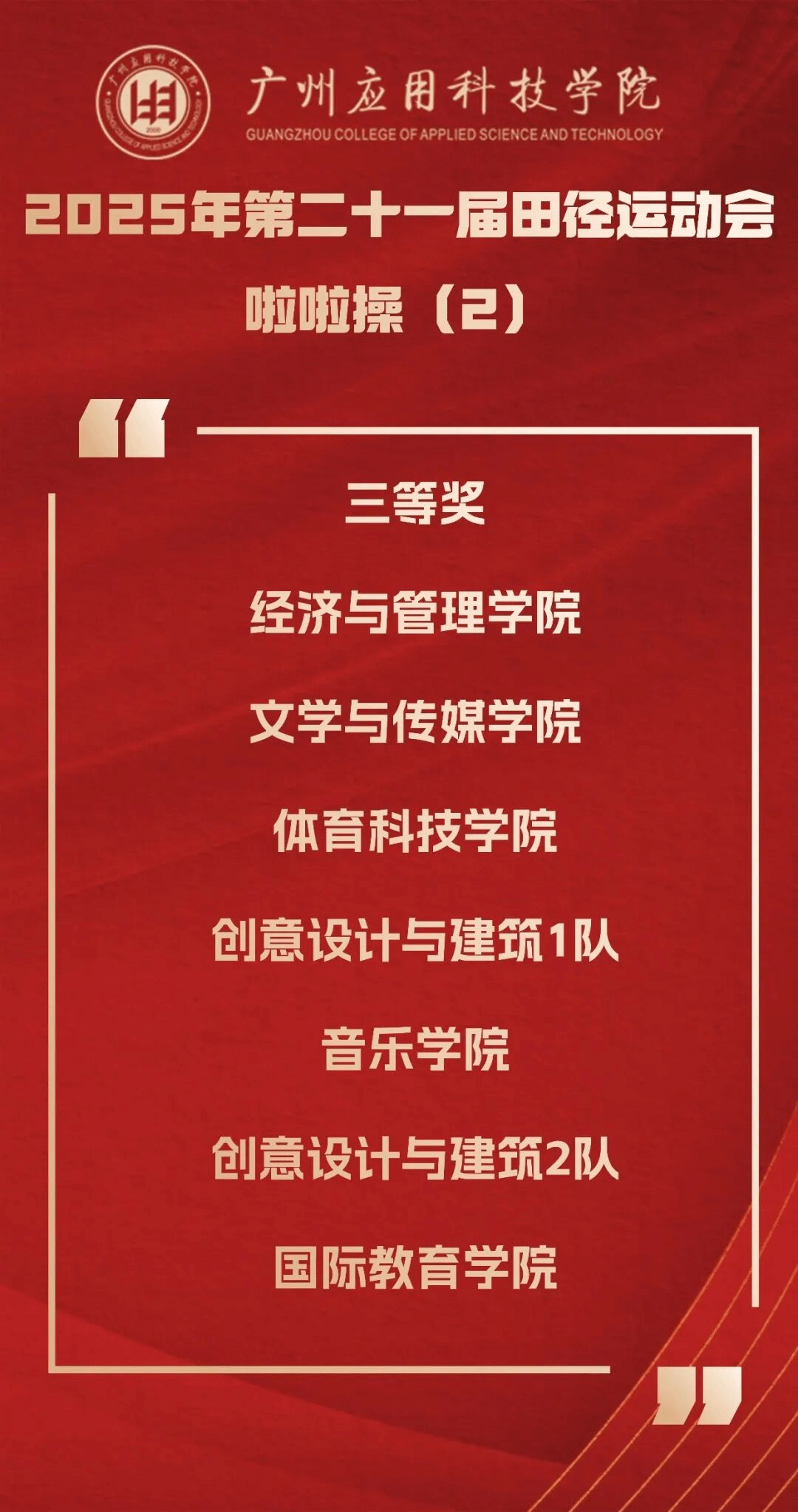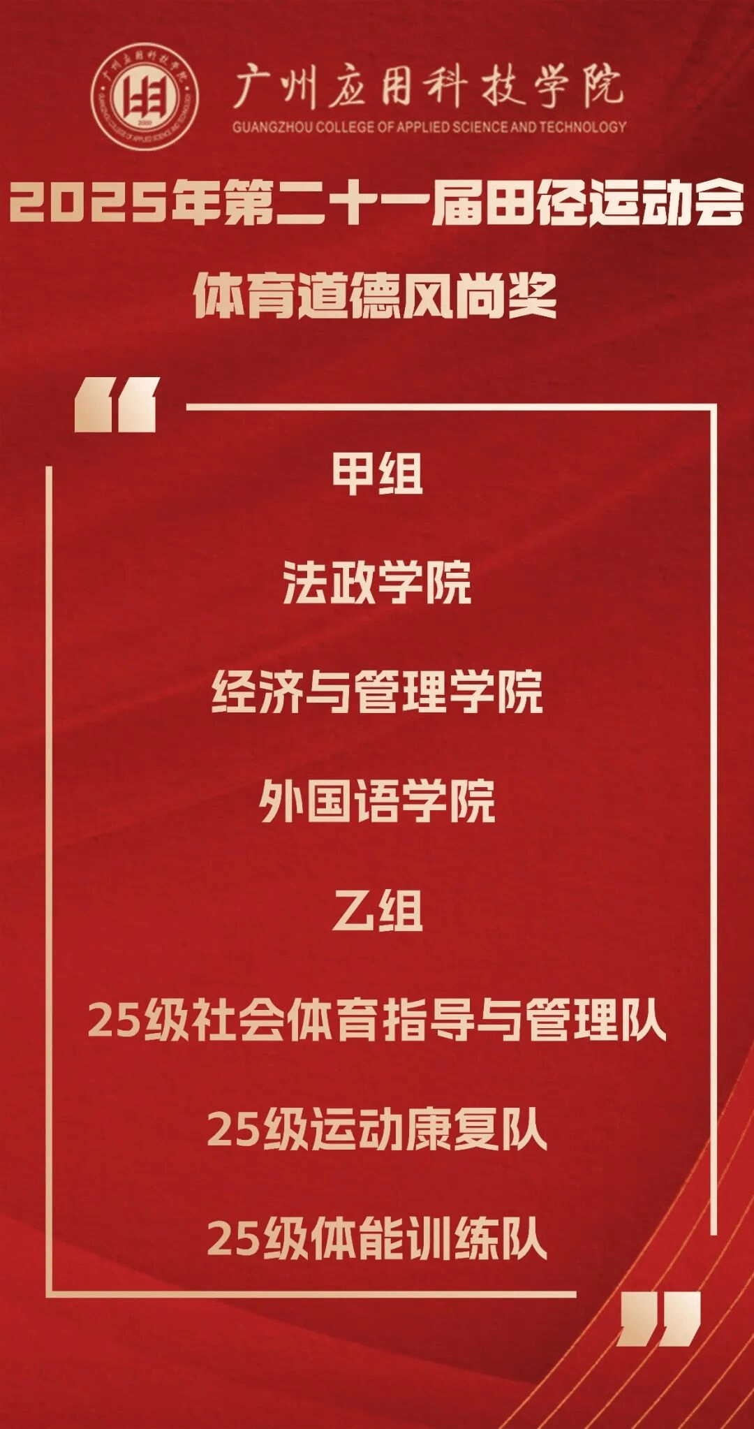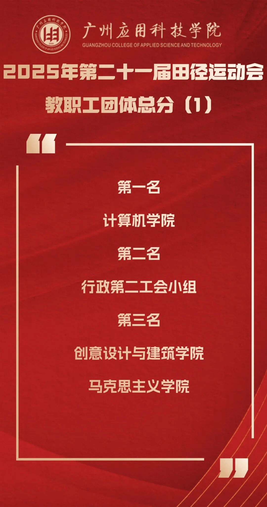 正当年!在校庆25周年的特殊节点,第21届校运会的帷幕已然落下,但拼搏进取、团结协作的体育精神已在校园深深扎根。本届运动会的成功举办,是广州应用科技学院“体教融合”结出的硕果,是“体育强校”建设迈出的坚实一步,更是学校落实“五育并举”、构建高水平育人体系的生动写照。它启示我们,健全的人格寓于健康的体魄,教育的真谛在于全面发展的追求。展望未来,全体广应科人必将承载着赛场上的激情与荣耀,将顽强拼搏之志、团结协作之风融入日常学习工作,持续践行“适者大成”的核心品牌理念,凝聚起推动学校高质量内涵式发展的磅礴力量,在新时代的征程上共同谱写更加绚烂的华章。