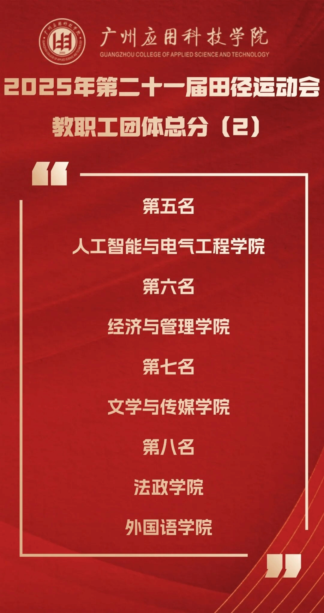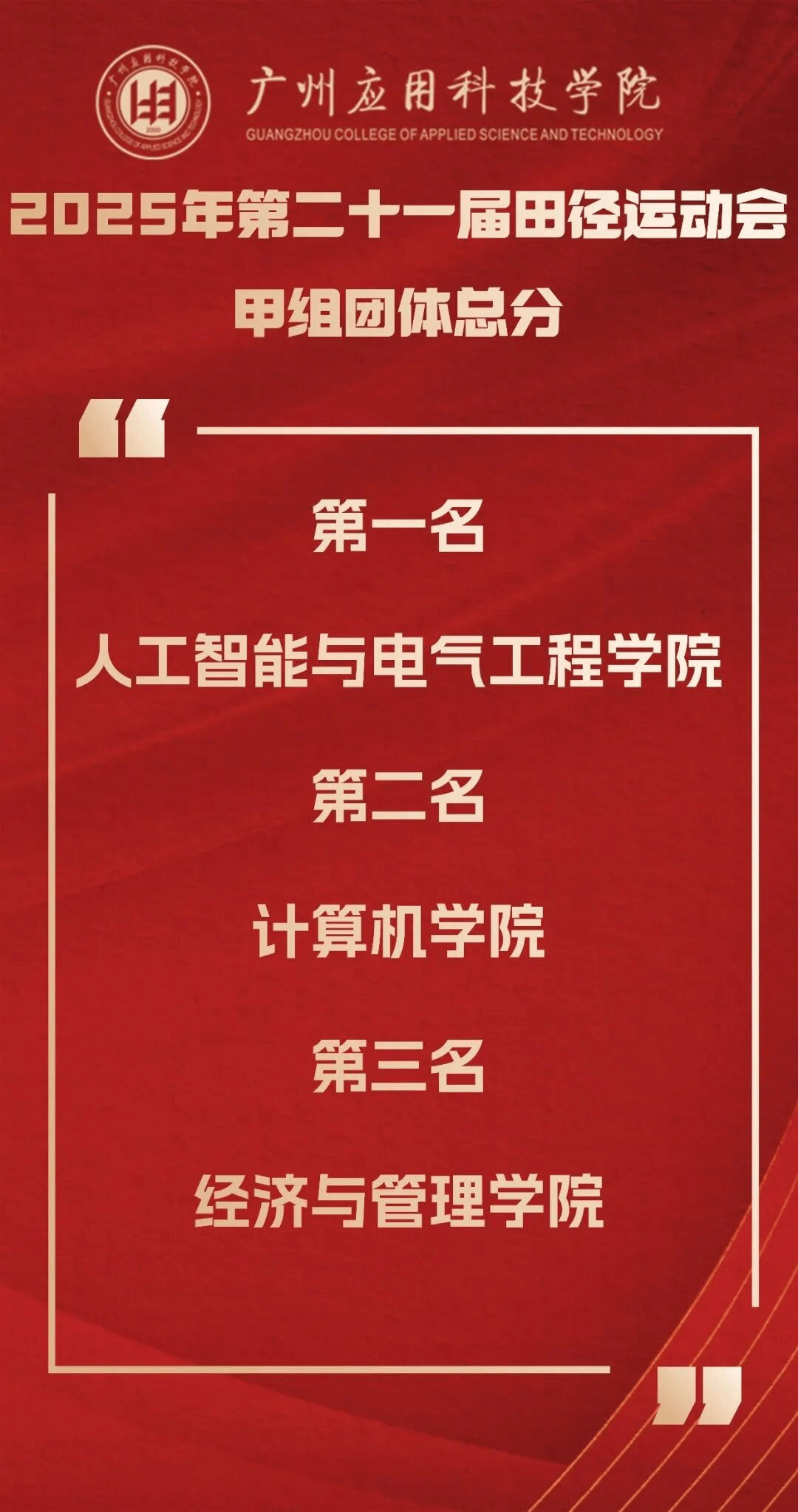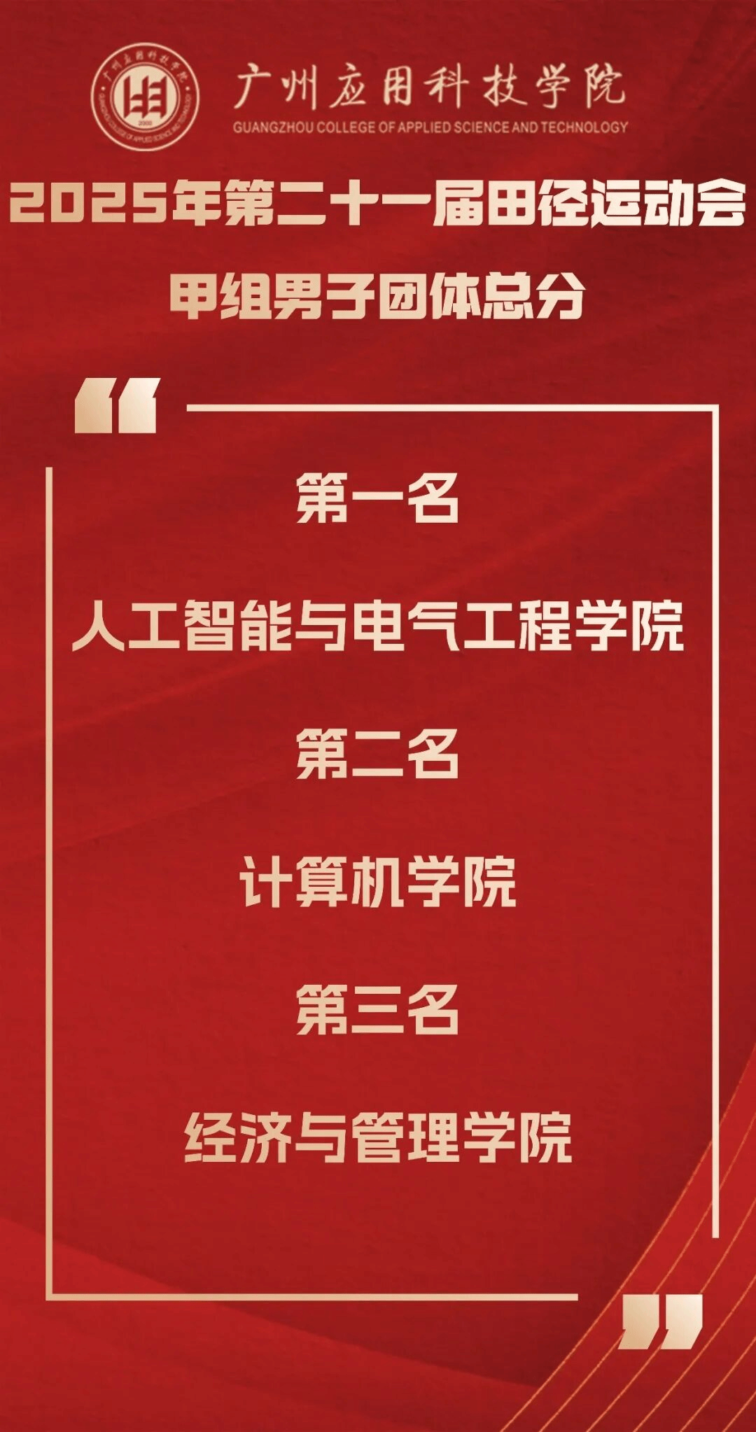 经过2天的激烈角逐,广州应用科技学院第21届田径运动会团体总分冠军诞生,人工智能与电气工程学院夺得第一名,打破了法政学院已连续夺得两届校运会总冠军的竞争“格局”。