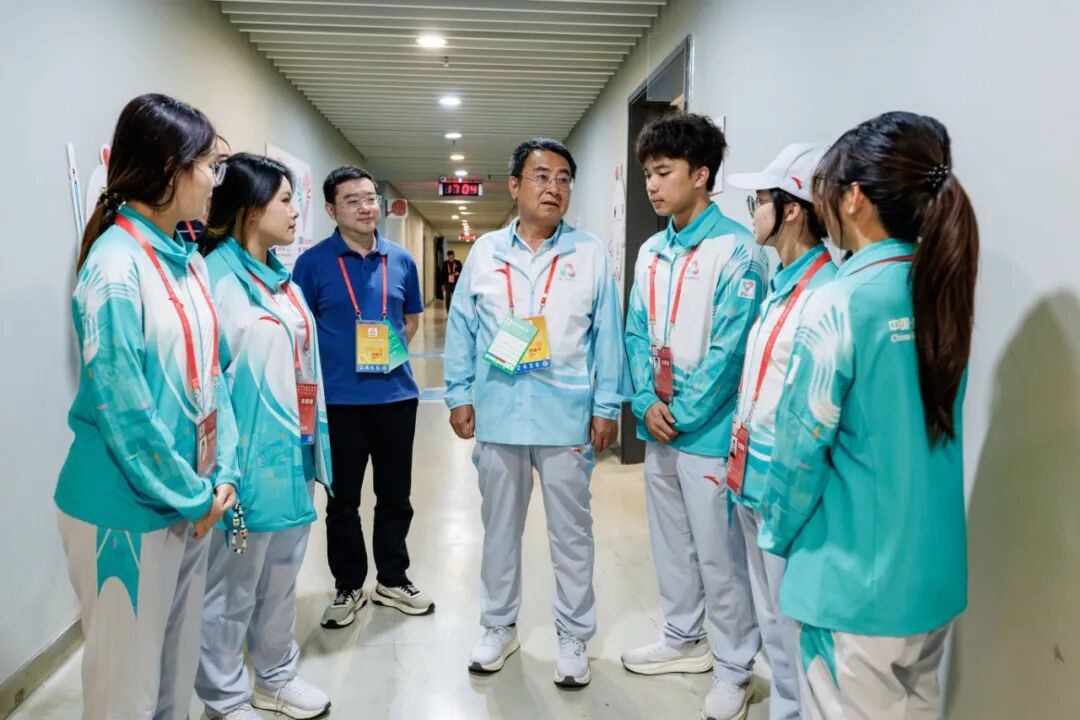 陈光团书记一行深入志愿服务一线,走访各服务岗位,详细了解志愿者的工作强度、服务内容与实际需求,并对“小海豚”团队的专业表现给予高度肯定。从总记录、颁奖礼仪到观众服务,志愿者们始终以严谨细致的态度和饱满昂扬的热情坚守岗位,以专业高效的服务保障了体操比赛的顺利进行,充分展现了广应科青年勇于担当、甘于奉献的精神风貌。学校领导还为志愿者们送上慰问物资,将温暖与关怀传递至服务一线,进一步激发了大家的服务热情与干劲。