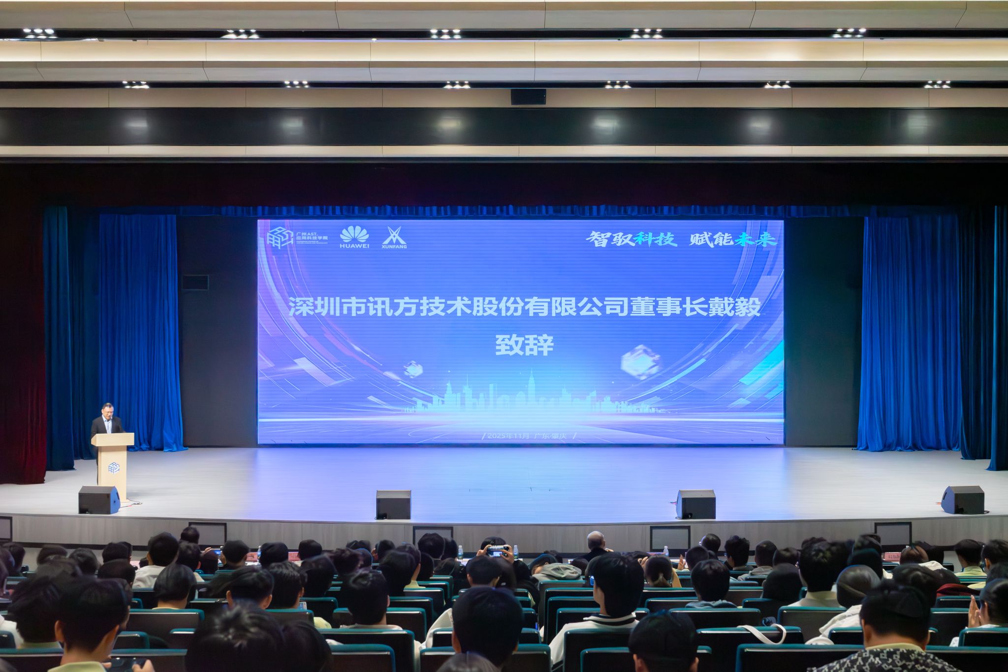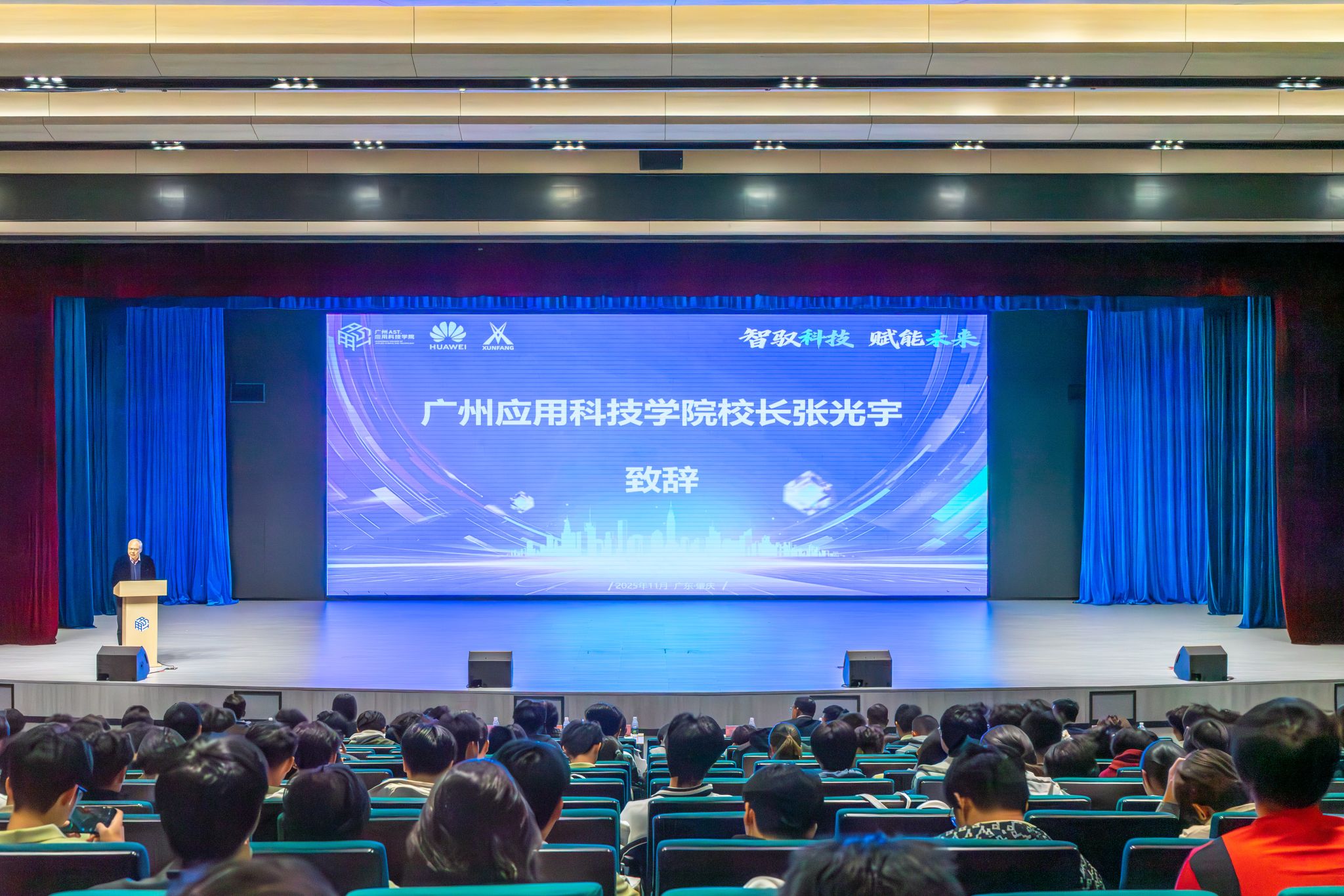 在“智驭科技 赋能未来”主题讲座上,广州应用科技学院张光宇校长致辞,代表学校向远道而来的印浩洋经理致以最热烈的欢迎,向与我校携手深耕产教融合的战略伙伴——深圳讯方科技,特别是戴毅董事长的倾情投入,表示最衷心的感谢。