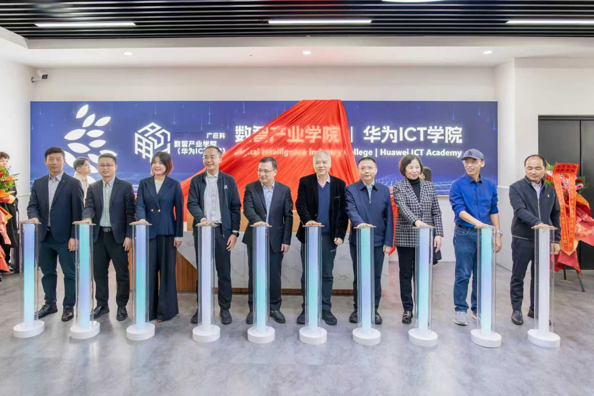 在广应科肇庆校区致用楼四楼,红色幕布在全场倒计时中徐徐揭开,“广州应用科技学院数智产业学院(华为ICT学院)”标识庄严呈现,标志着这一产教融合平台正式启用。