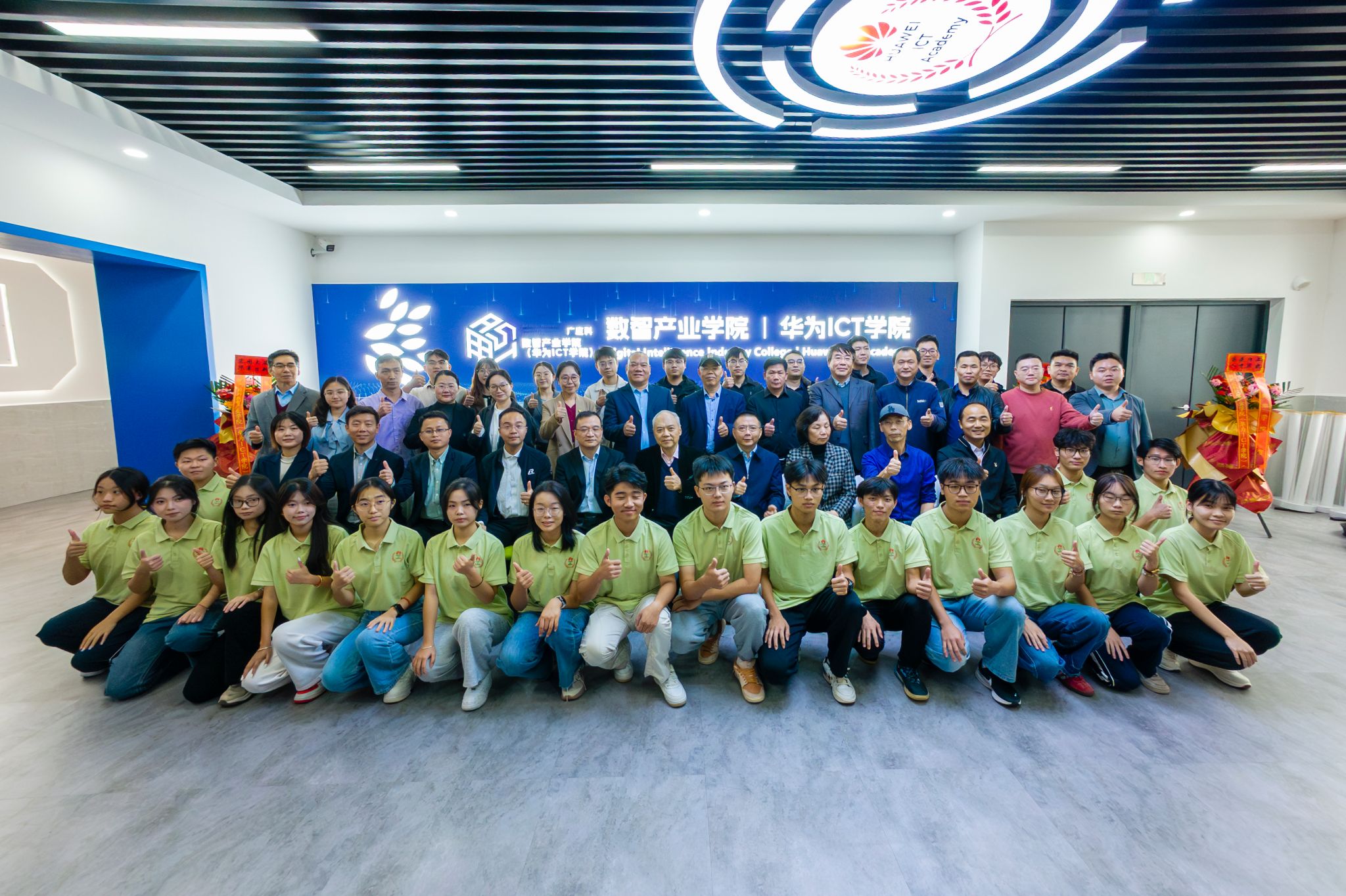 广州应用科技学院校长张光宇、常务副校长吴舸、副校长刘志新,华为技术有限公司广东产业发展与生态部人才经理印浩洋,深圳市讯方技术股份有限公司董事长戴毅、华南片区总经理邱韶杰、广州区域总经理陈亮、华南片区市场总监刘自荣,广州华商技术有限公司总经理王希揽、市场总监何发新,以及学校相关职能部室与学院负责人、数智产业学院(华为ICT学院)全体教师共同出席活动并为产业学院揭牌。仪式由数智产业学院院长刘佩伟主持。