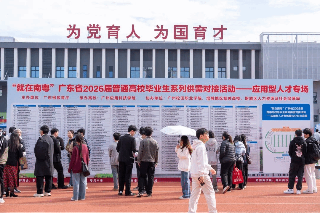 为深入贯彻落实国家及广东省关于促进高校毕业生就业创业的决策部署,全力搭建高校毕业生与用人单位高效对接平台,11月22日,由广东省教育厅主办、广州应用科技学院承办的“就在南粤”广东省2026届普通高校毕业生系列供需对接活动——应用型人才专场招聘会,在广应科广州校区运动场隆重举行。本次招聘活动不仅是广东省教育厅面向2026届高校毕业生举办的唯一一场应用型专场招聘会,也是该系列招聘活动在增城举行的唯一一场招聘会,同时正值广州应用科技学院25周年校庆倒计时一个月之际,体现了广东省教育厅对广应科办学成果和办学实力的充分肯定,更是广应科深化产教融合、服务区域经济发展的生动实践。
