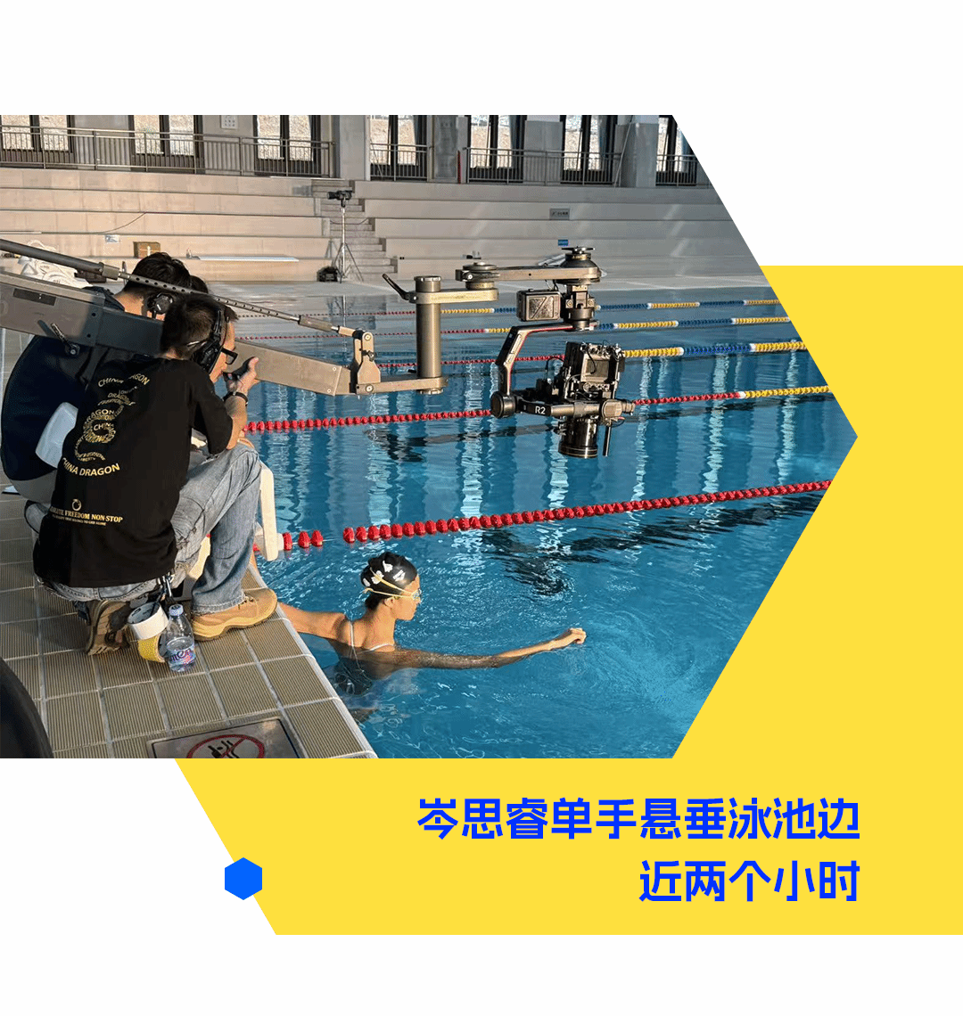 作为镜头里的主演,岑思睿自然成了“动静结合”的调度中心。“动”,要求她无数次起跳,调整入水姿势,帮助摄像师捕捉到最完美的光影瞬间;“静”,则要依靠岑思睿自己的核心力量,单手悬垂泳池边近两个小时。