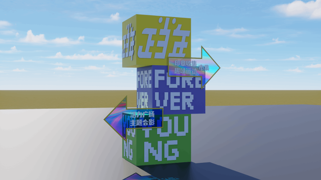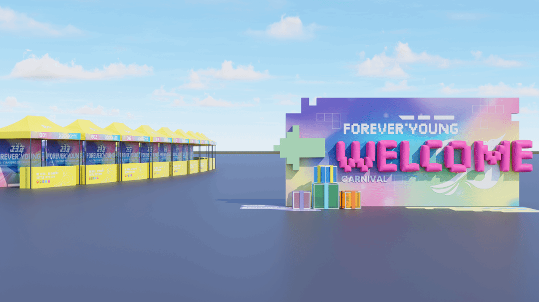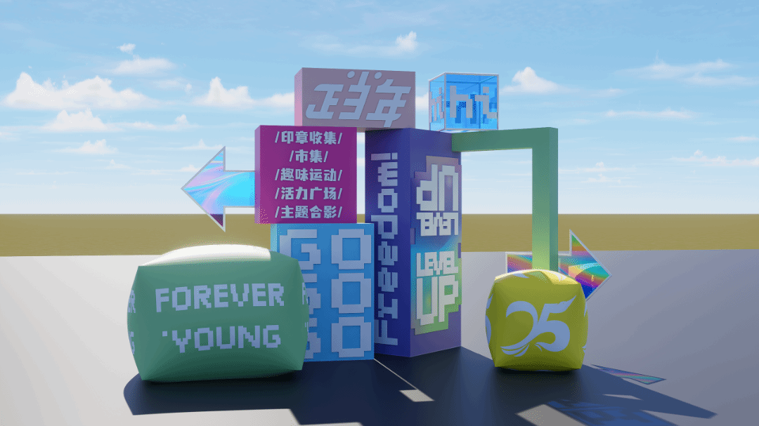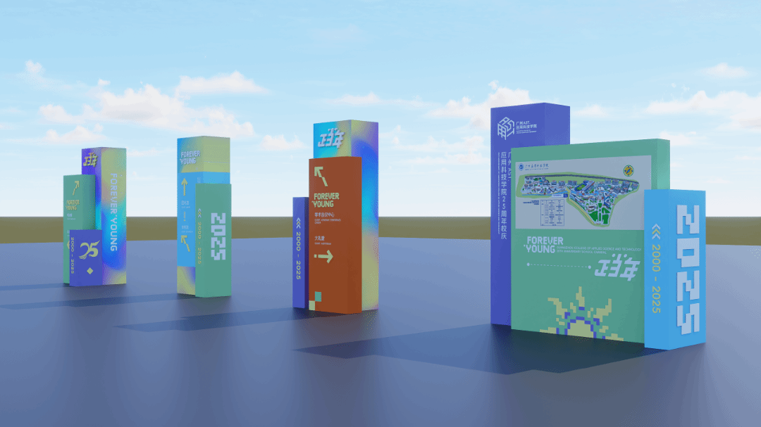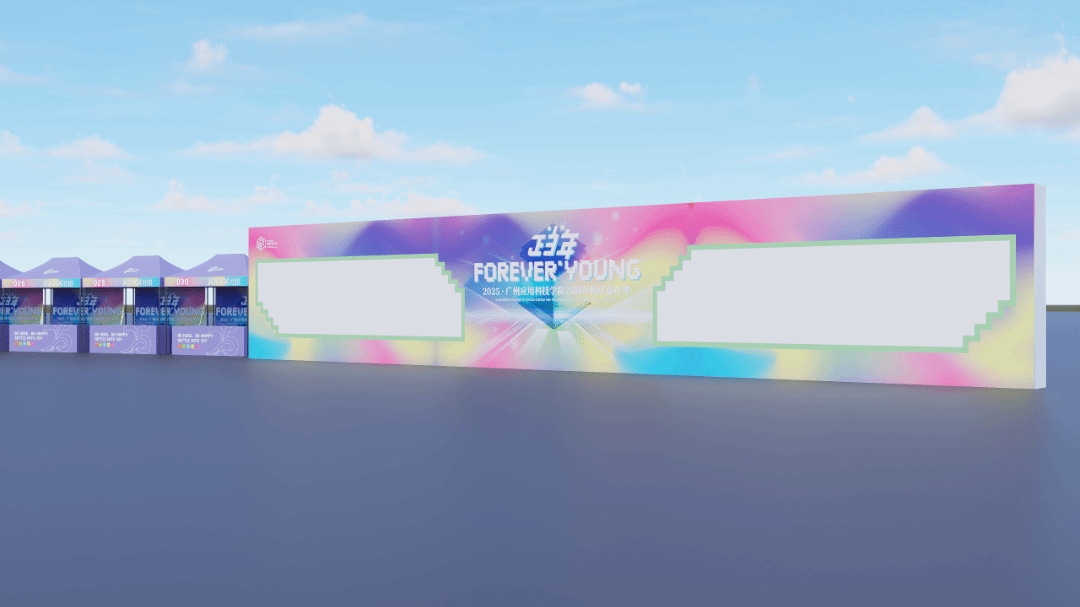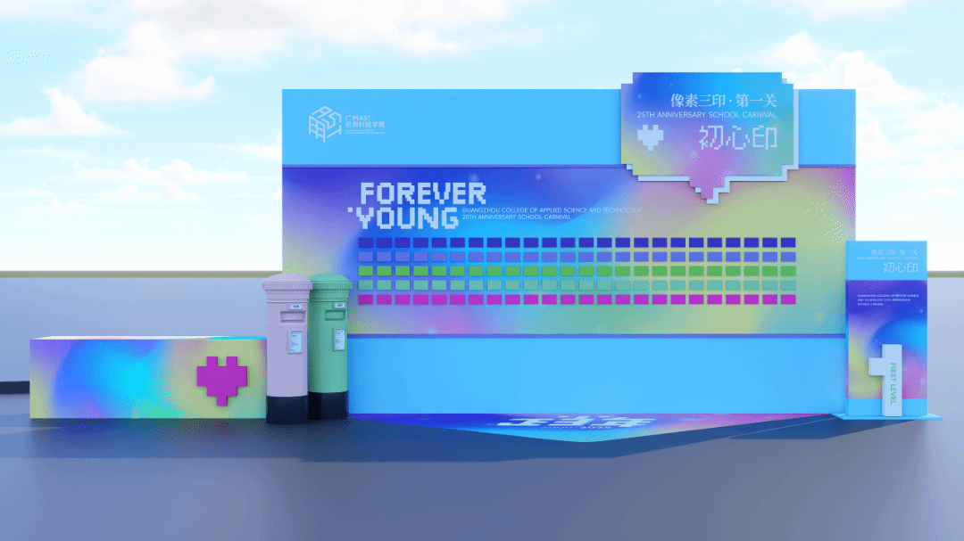 这一设计理念将在嘉年华中得到极致演绎。从踏入校门的那一刻起,您将进入一个由像素艺术构成的平行世界。无处不在的“FOREVER YOUNG”主题口号,以充满活力的像素字体出现在地贴、道旗、堡垒和装饰墙上,宣告着广应科与广应科人永葆的青春内核。“适者大成”“正当年” 等字样与校训“博学笃行,经世致用”一道,通过像素化的艺术处理,既庄重又新颖,传统精神与现代视觉在此完美碰撞。