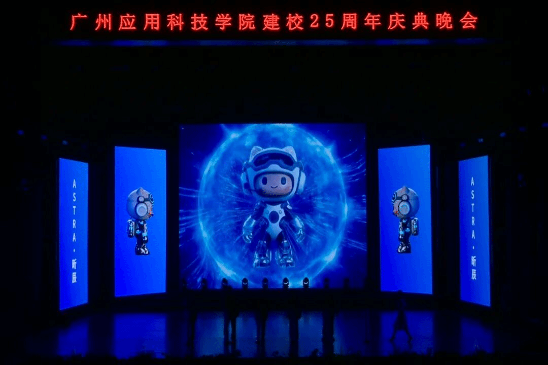 当璀璨灯光聚焦舞台,当热切期待盈满全场,广应科吉祥物“昕晨”Astra于晚会启幕前惊艳亮相!广州应用科技学院常务副校长吴舸,党委副书记、副校长刘志新,2001级校友王泽锋和蔡伟杰,与校庆当天生日的23级机器人工程1班肖炜佳同学、24级英语4班连曦同学携手,按下启动装置,正式开启了吉祥物昕辰Astra的正式发布。它承载着莘莘学子笃行不倦、上下求索的校园精神内核,联结着广应科师生和校友同心同向的深厚情谊,更是学校活力风貌与创新气魄的全新象征,见证着每一份青春的炽热,每一次突破的荣光。