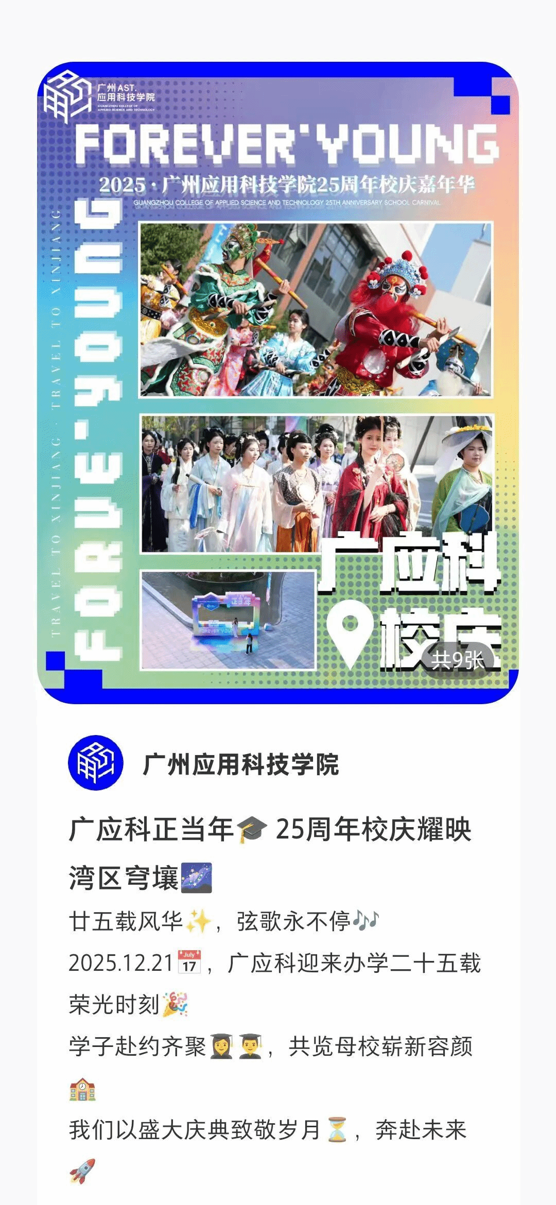 当日的狂欢虽在夕阳中落幕,但快乐与感动却在网络空间持续延烧。小红书、抖音等社交平台上,“广应科25周年校庆”迅速成为热门话题。师生、校友们纷纷晒出自己收获的九宫格美图:有像素打卡点的创意合影,有市集上淘到的宝藏好物,有舞台前跟着音乐尽情舞动的瞬间,也有与老同学重逢的感人画面。#广应科校庆像素风#、#我的青春打卡册#、#母校永远年轻#等标签下,充满了自豪、怀念与祝福。这些自发的内容分享,让校庆的精彩突破了校园的物理边界,形成了一场持续的线上庆典,也让“Forever Young”的声浪传得更远。