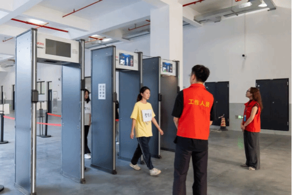 考生从正门进入,沿着现场指引标识前往右侧环校通道前行,到达第10栋教学楼右侧台阶有序排队上楼,到达10栋204室存放个人物品,与考试无关的物品不允许带入考场。存放个人物品后,在二楼封闭区内有序排队进行人脸识别和安检,通过后方可上楼进入考场。
