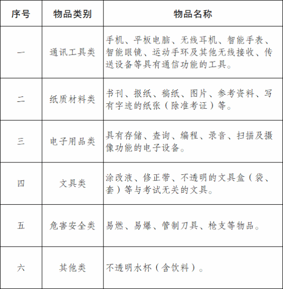 自学考试违规物品种类清单