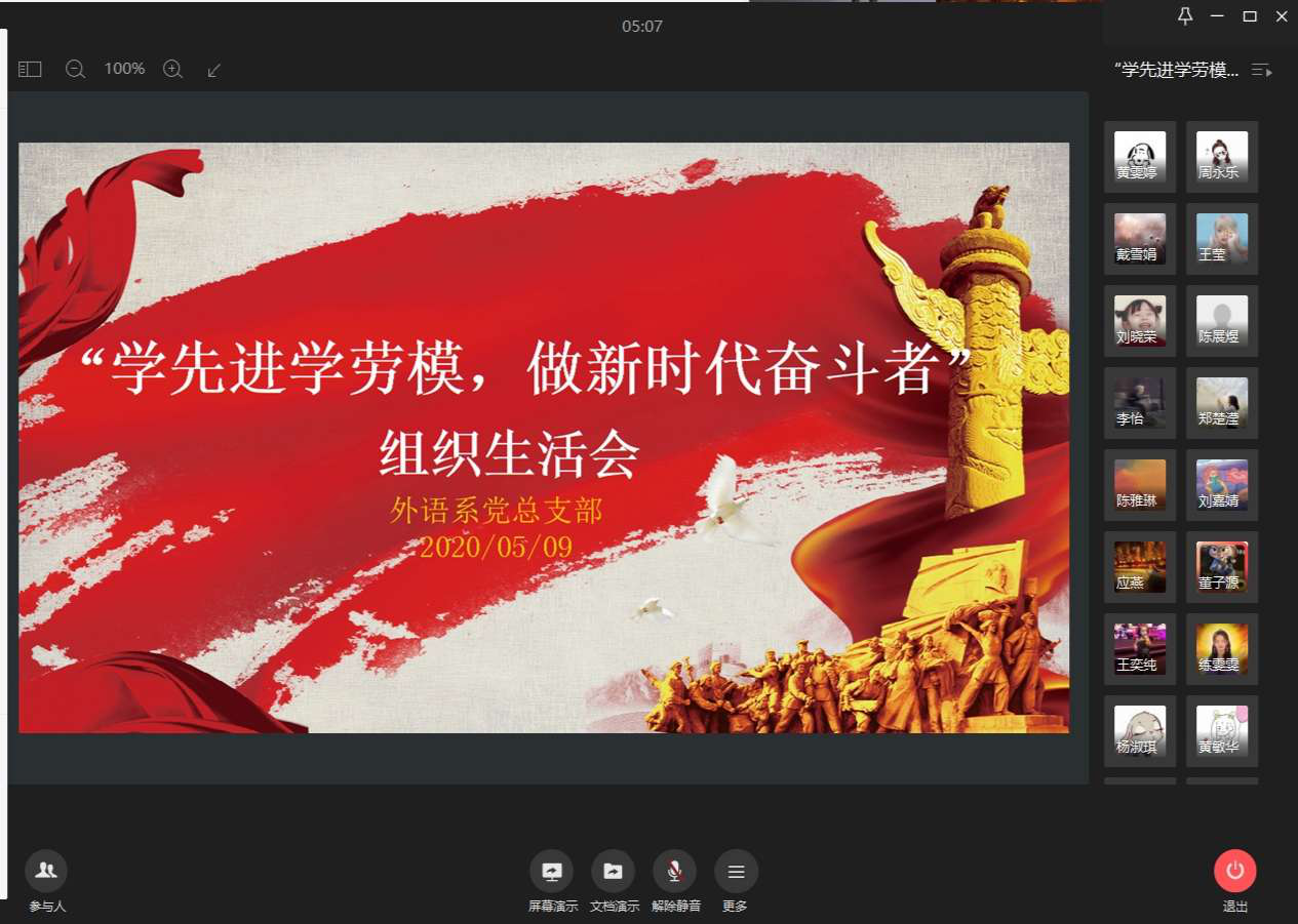 5月9日,外语系学生党支部在企业微信开展以“学先进学劳模,做新时代奋斗者”为主题的组织生活会。外语系第一学生党支部书记颜魁、第二学生党支部书记董子源以及全体学生党员参加会议。